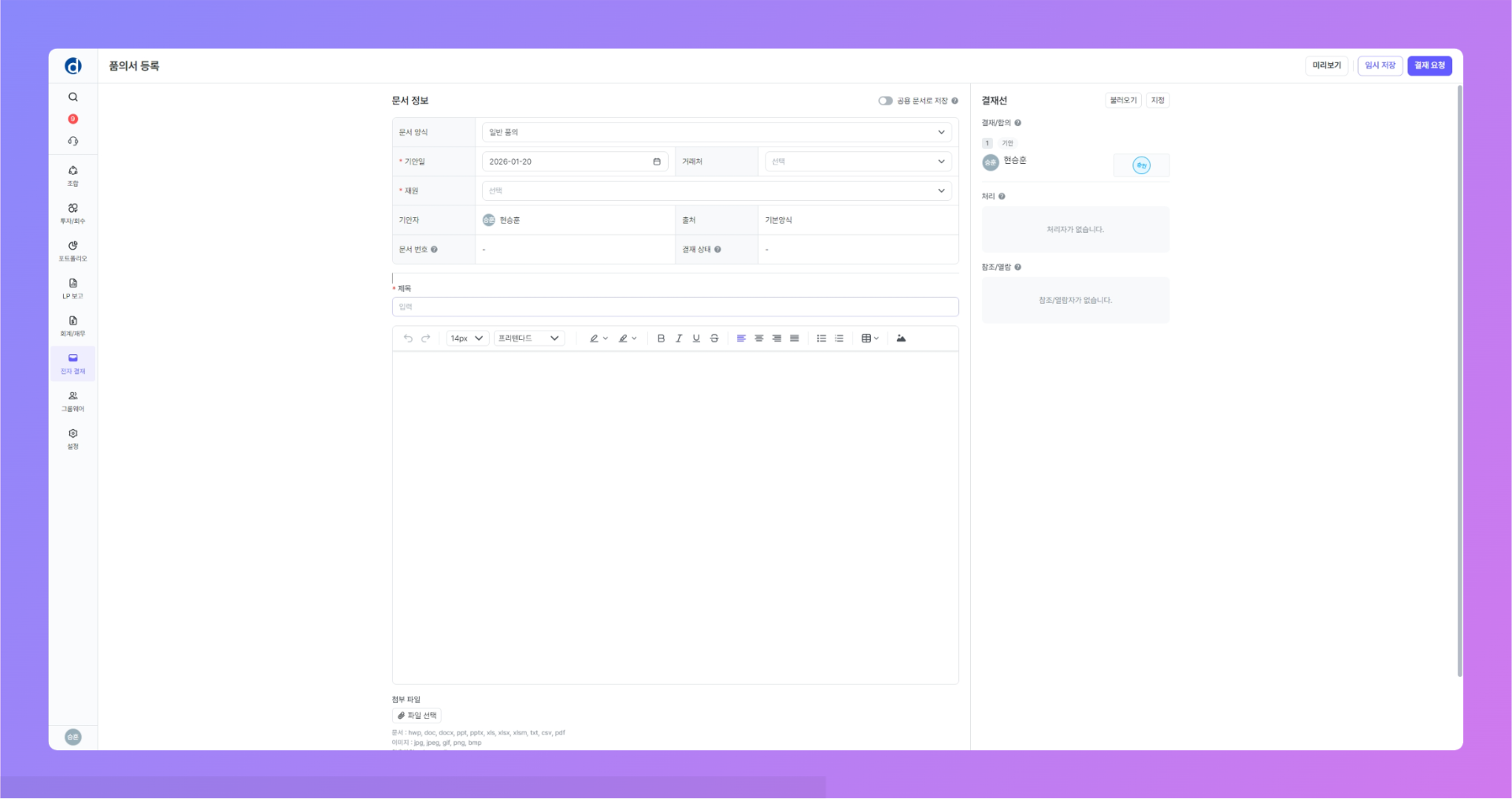 전자결재 > 품의서 등록 메뉴를 클릭하여 이동 해주세요.