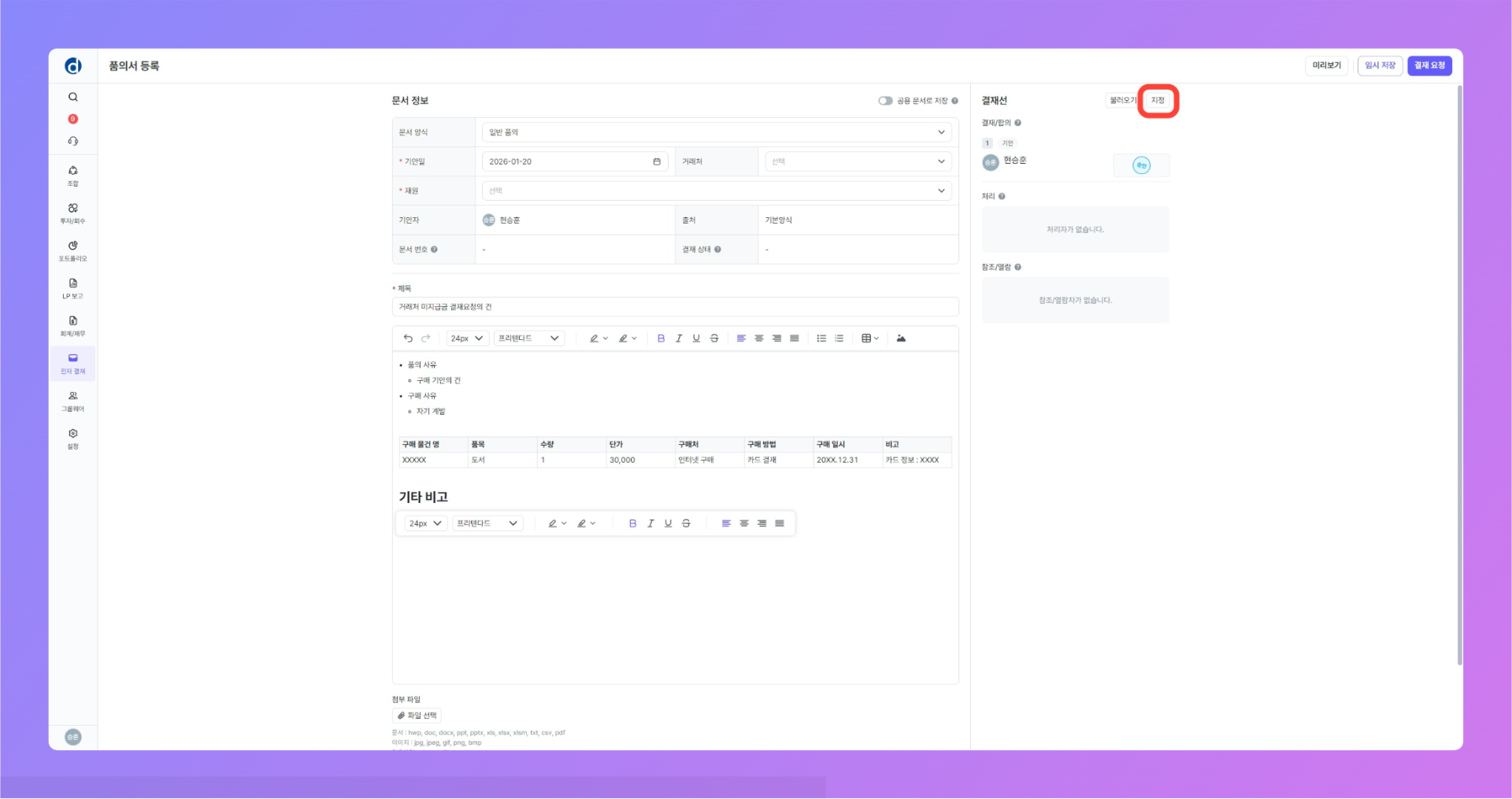 결재 라인의 지정이 완료 되었다면, 지정하신 상태에서 아래의 절차대로 진행 해주세요.