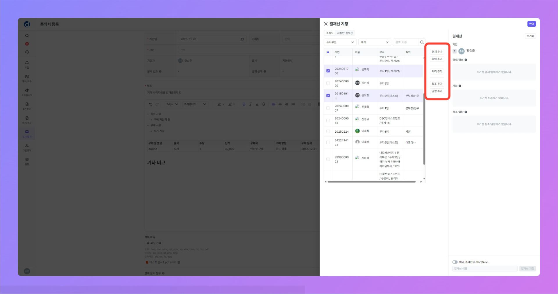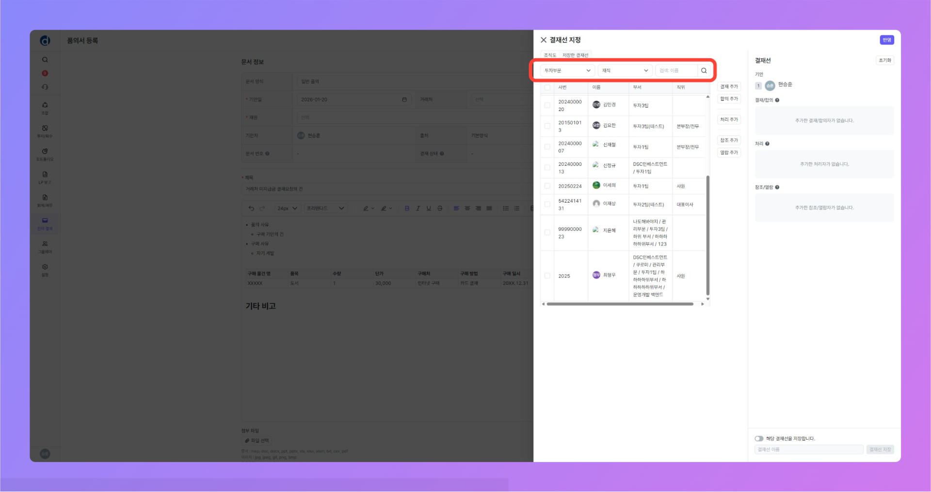 검색 기능을 통해, 결재선에 추가할 구성원을 검색 합니다.