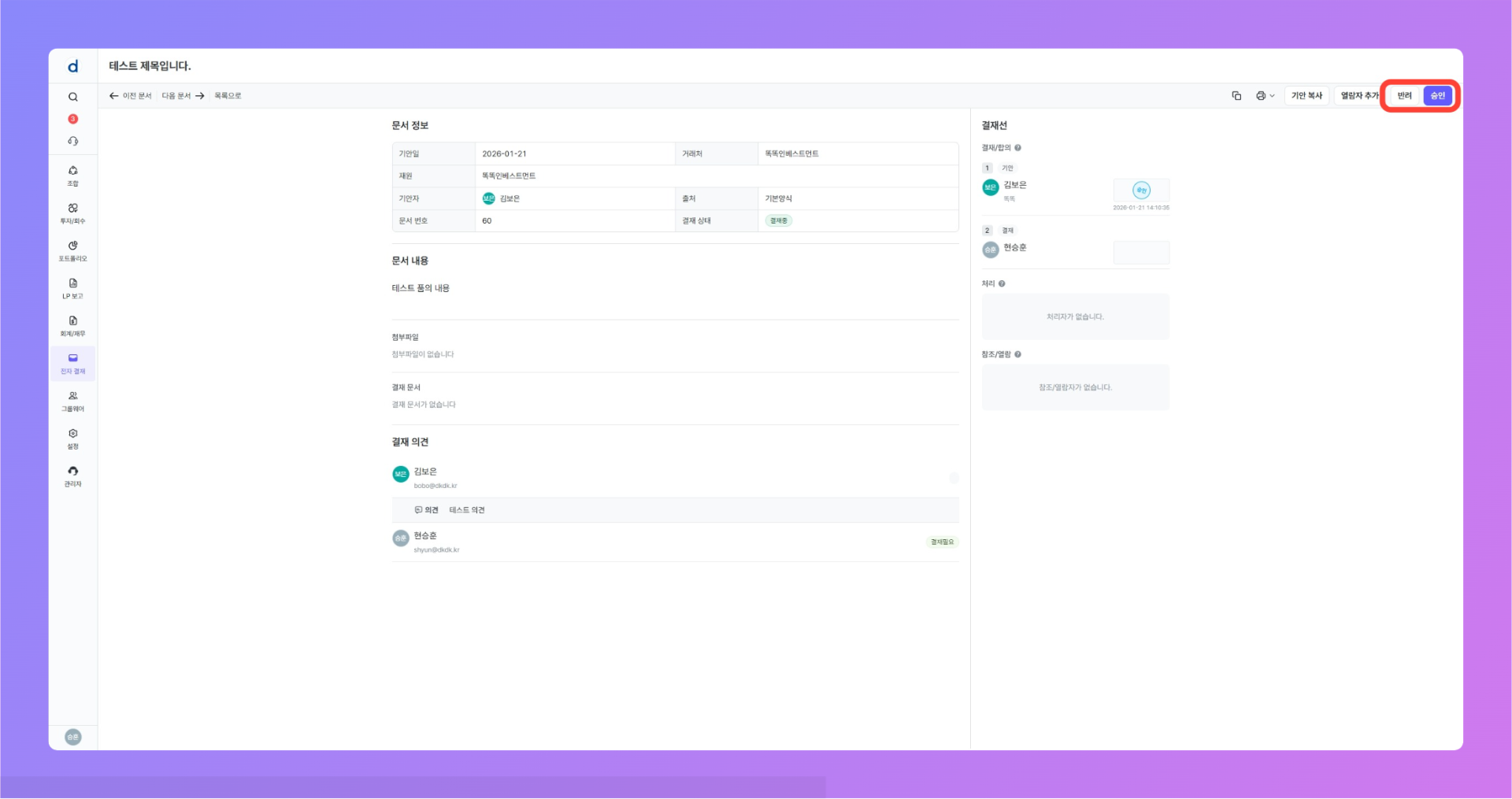 우측 상단의 [반려] 또는 [승인] 버튼을 클릭 해주세요.