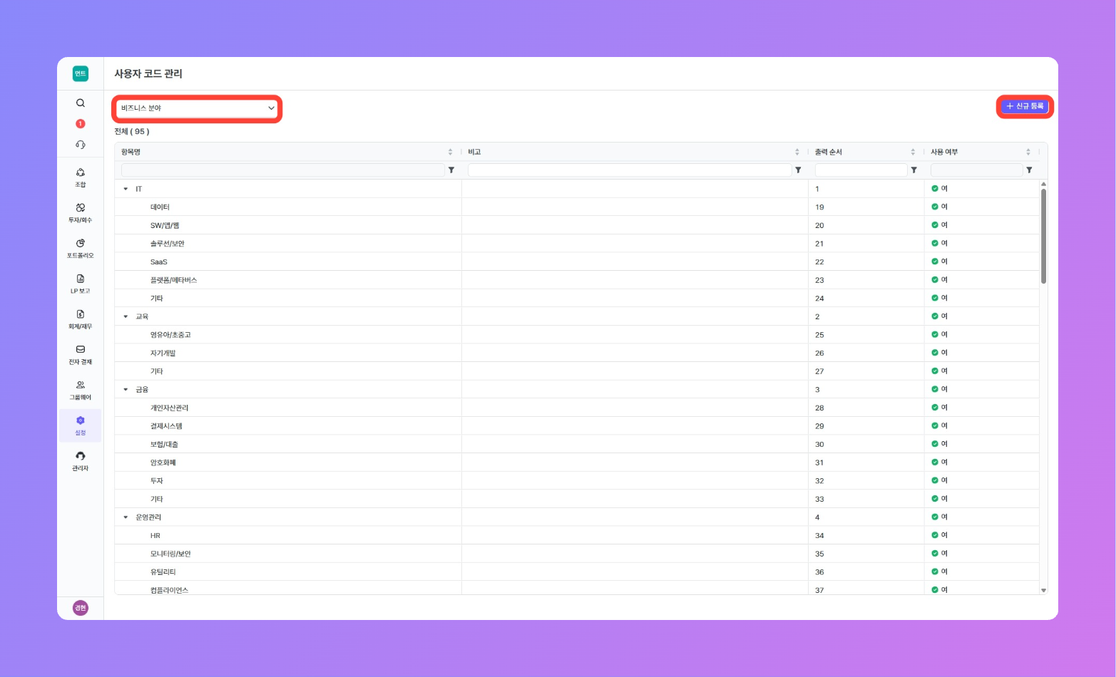 회사별 검토 이력, 투자 심의, 포트폴리오 정보 관리, BI 등에서 투자 검토 진행 중인 기업 또는 사후 관리 기업에 대한 비즈니스 분야 별 통계를 분류하는 기준을 사용자화할 수 있습니다.