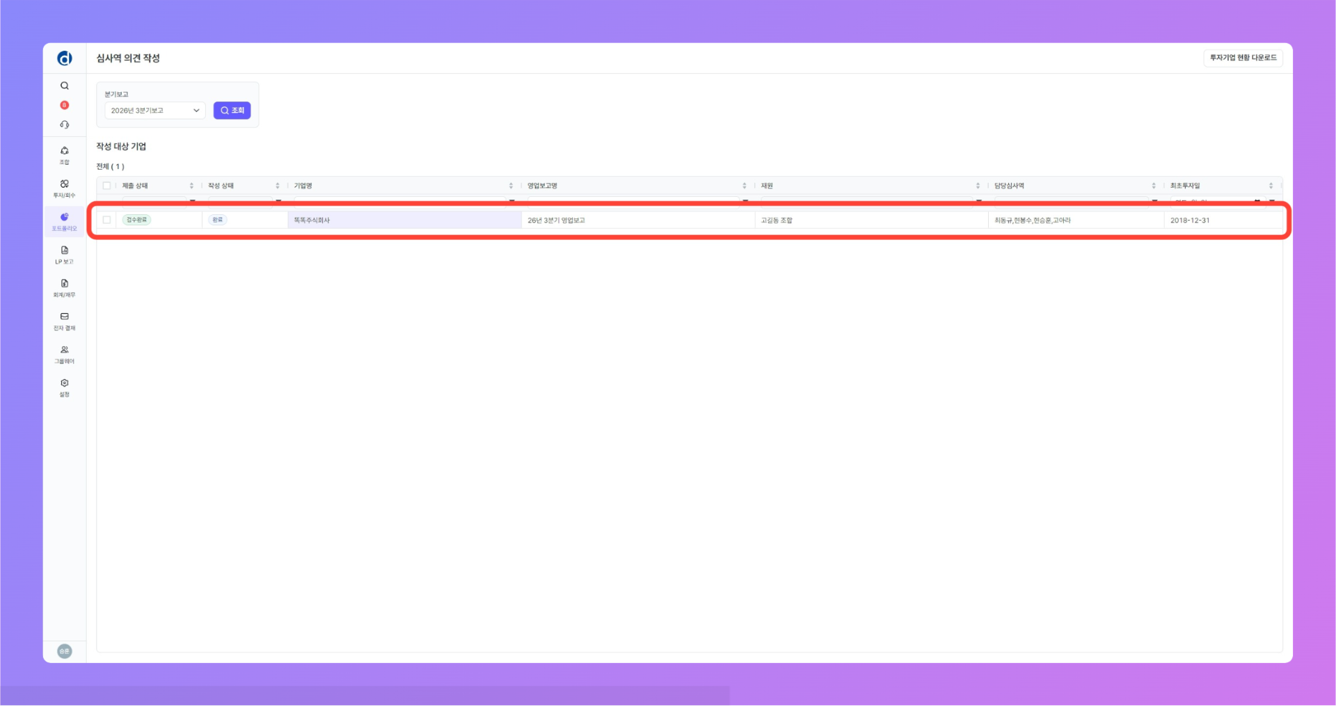 심사역 의견은 영업보고서 "6. 투자기업 세부현황" 섹션에 출력 됩니다.