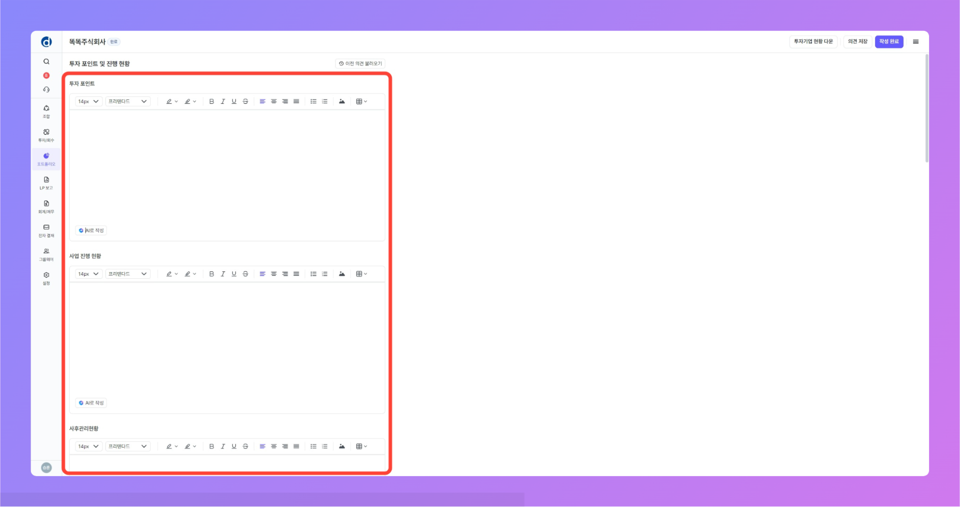 영업보고 내용의 참고가 필요하신 경우, 우측 상단 [투자기업 현황 다운] 버튼을 통해서 영업보고 투자 기업 섹션의 한글 파일 다운로드가 가능합니다.