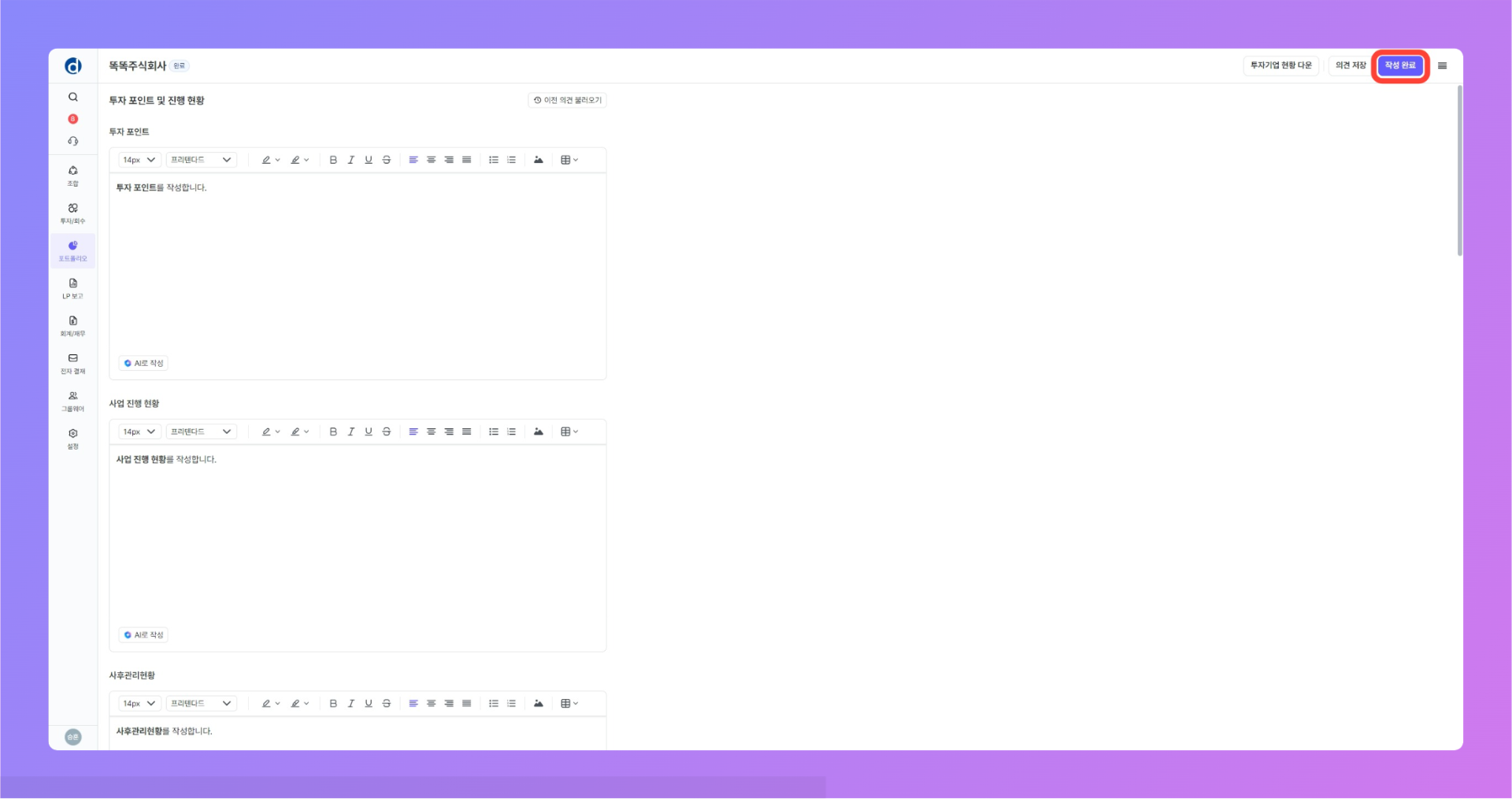 각 섹션에 대해서 심사역의 의견 사항을 기재합니다.