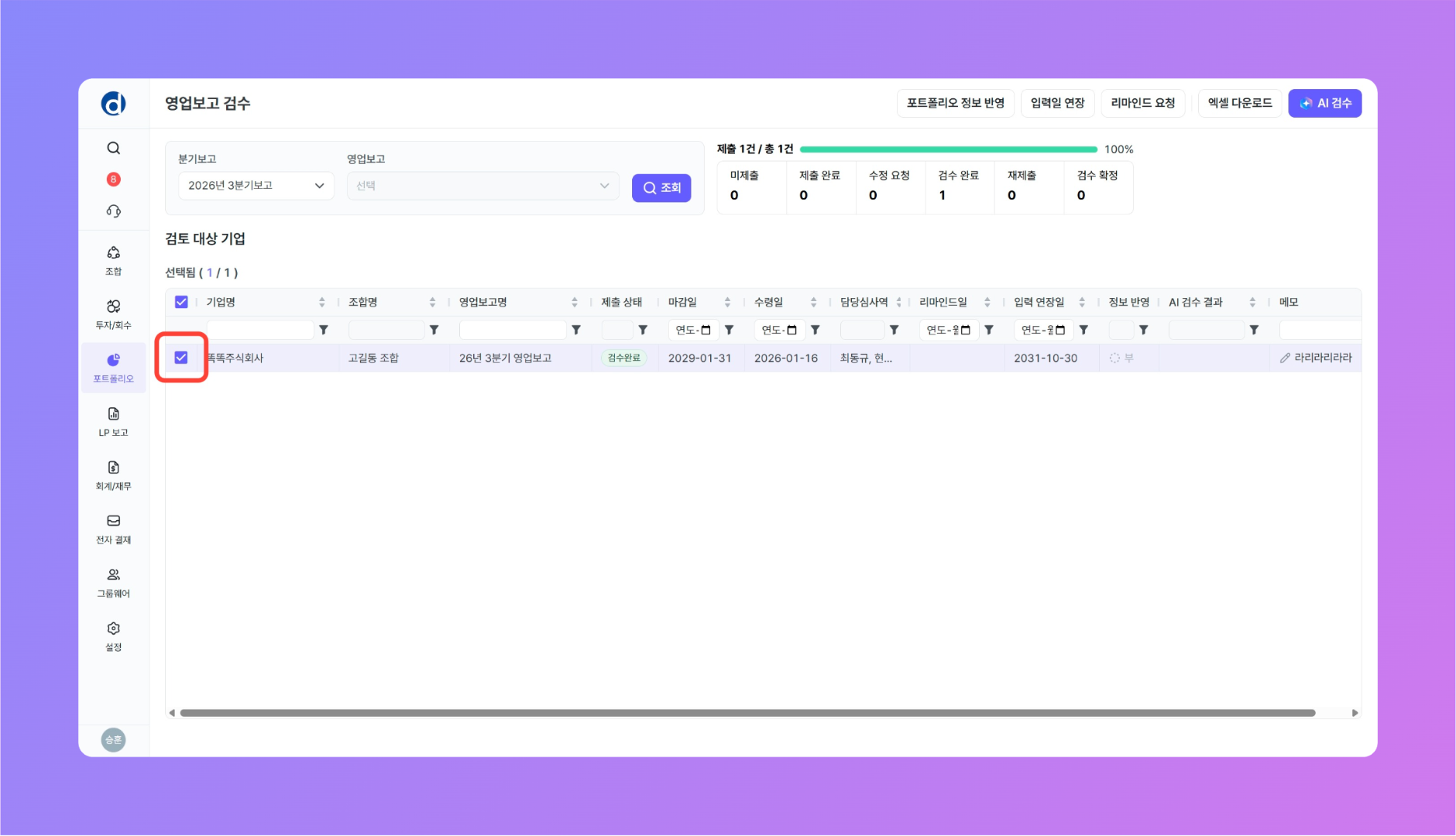 검수를 진행할 영업보고의 분기를 선택하고 [조회] 버튼을 클릭합니다.
