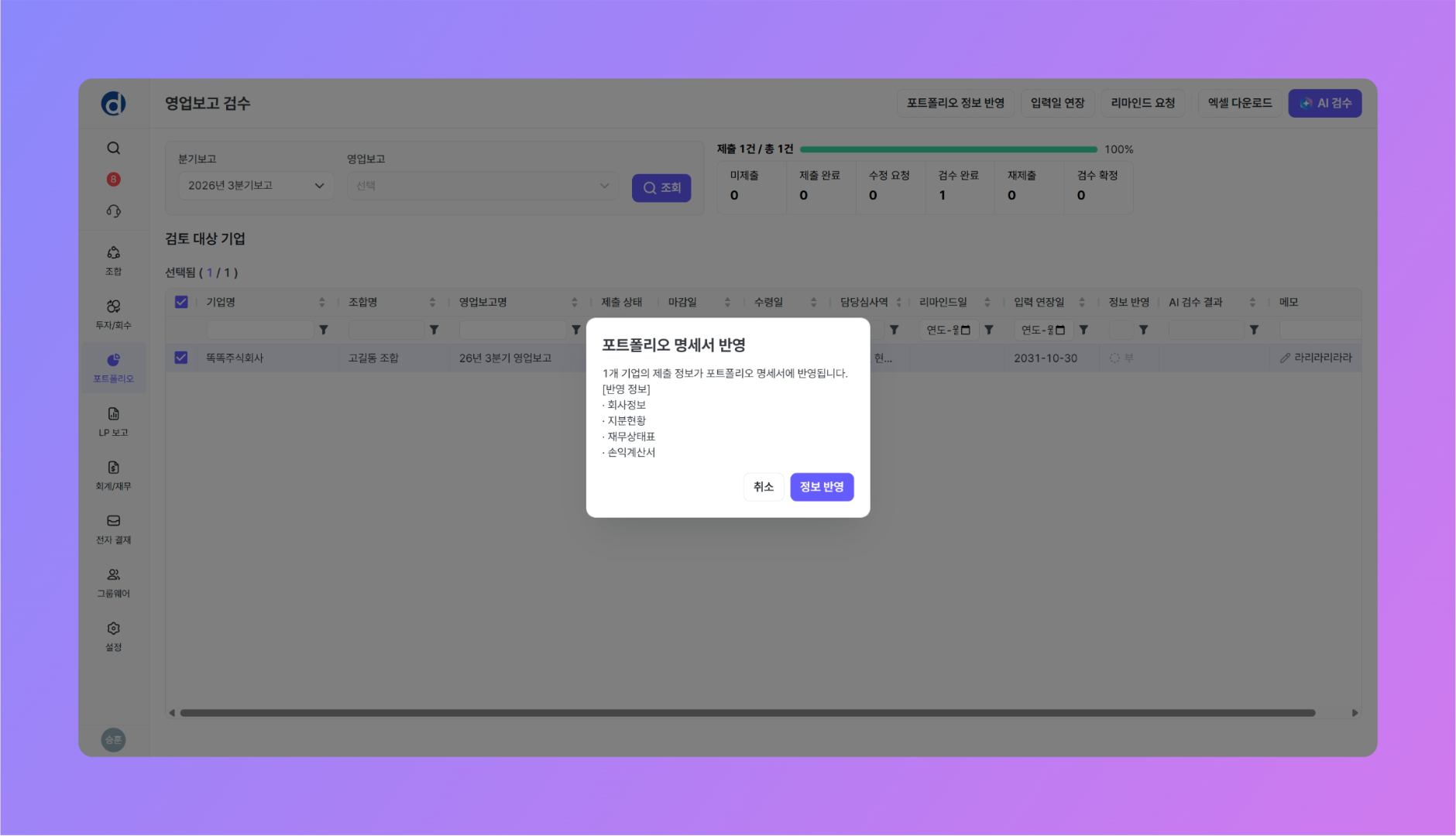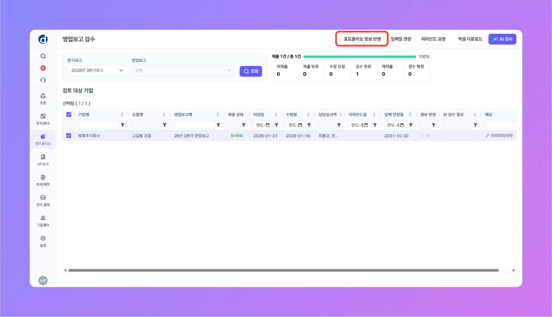 우측 상단의 [포트폴리오 정보 반영] 버튼을 클릭 해주세요.