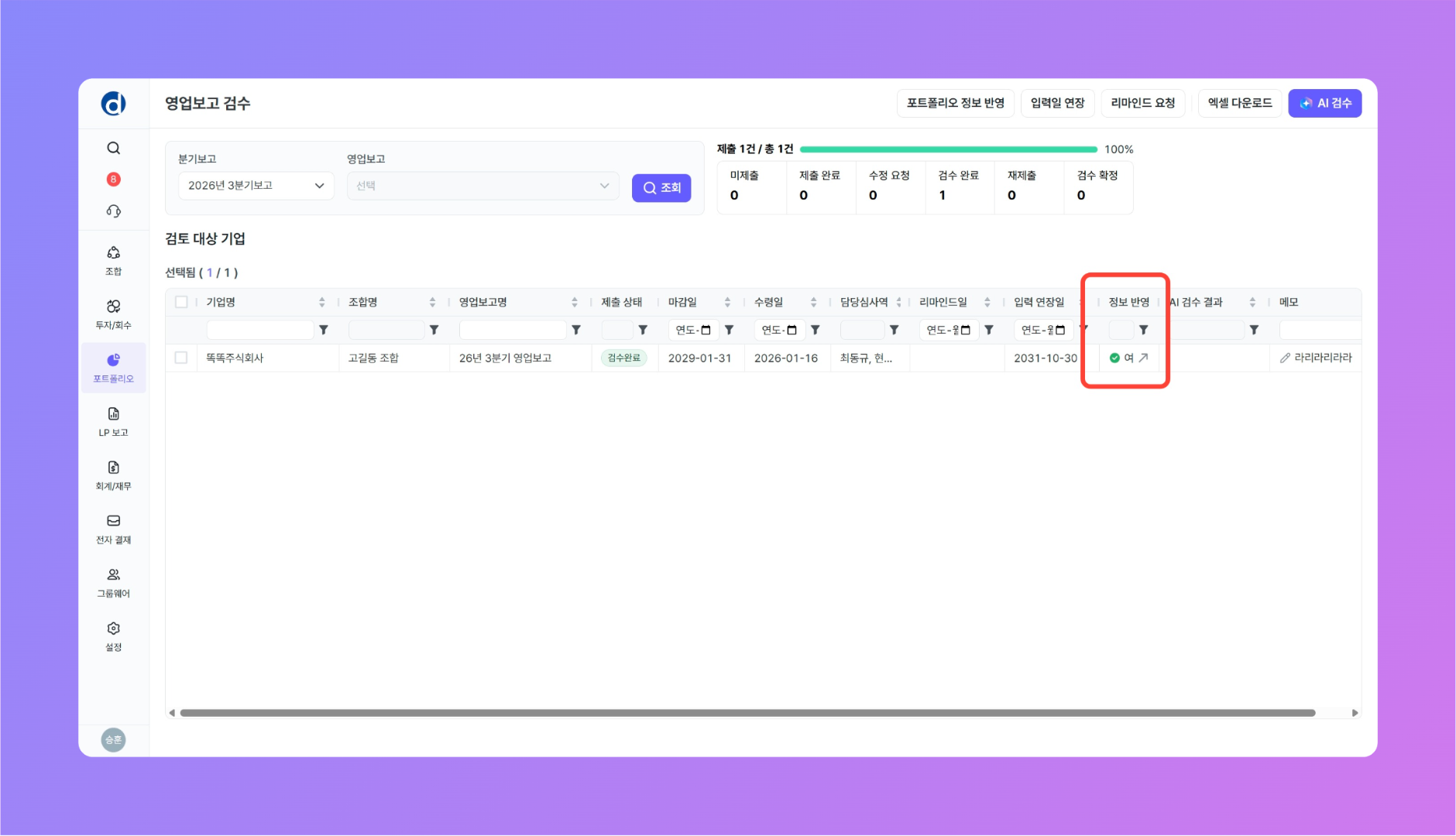 정보 반영이 정상 실행되면, 정보 반영 열의 값이 여 로 표시가 됩니다.