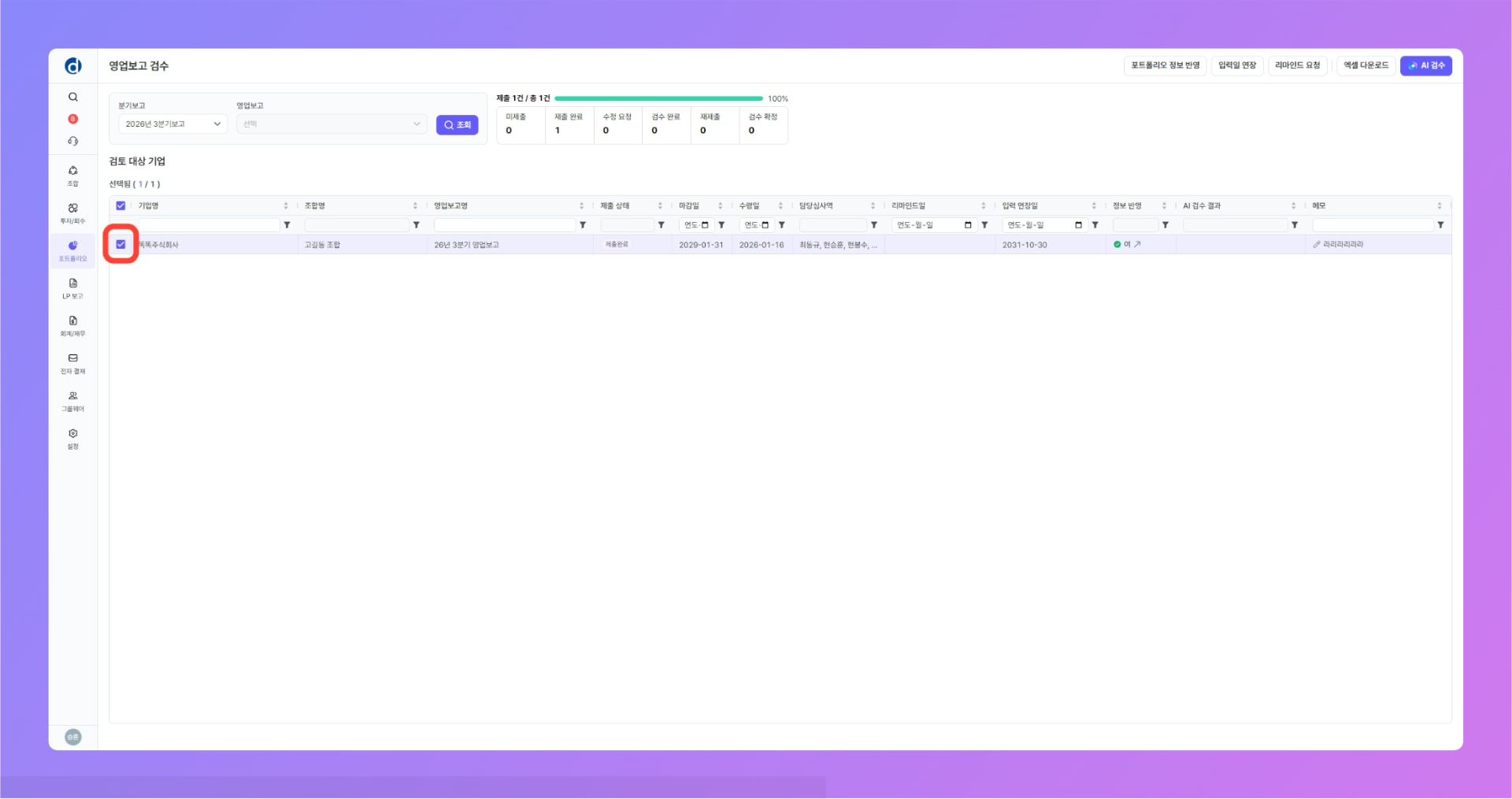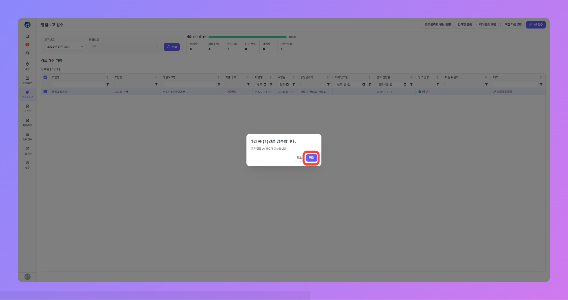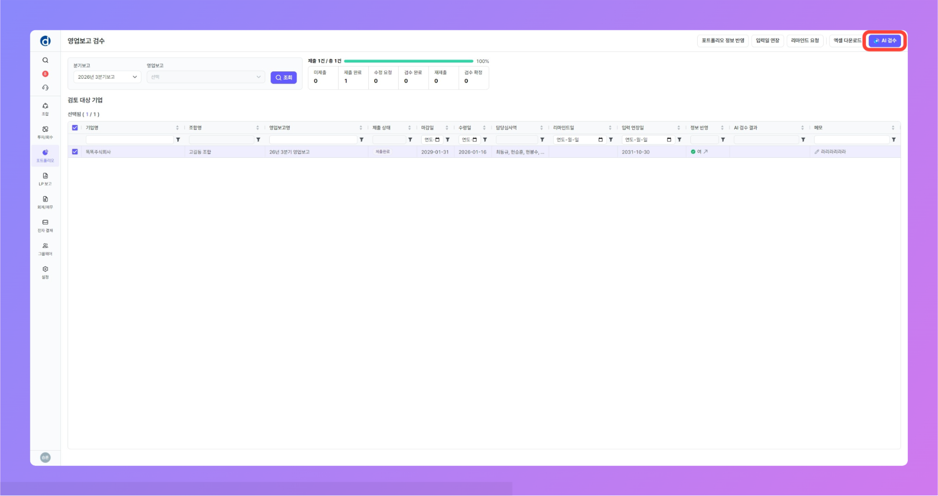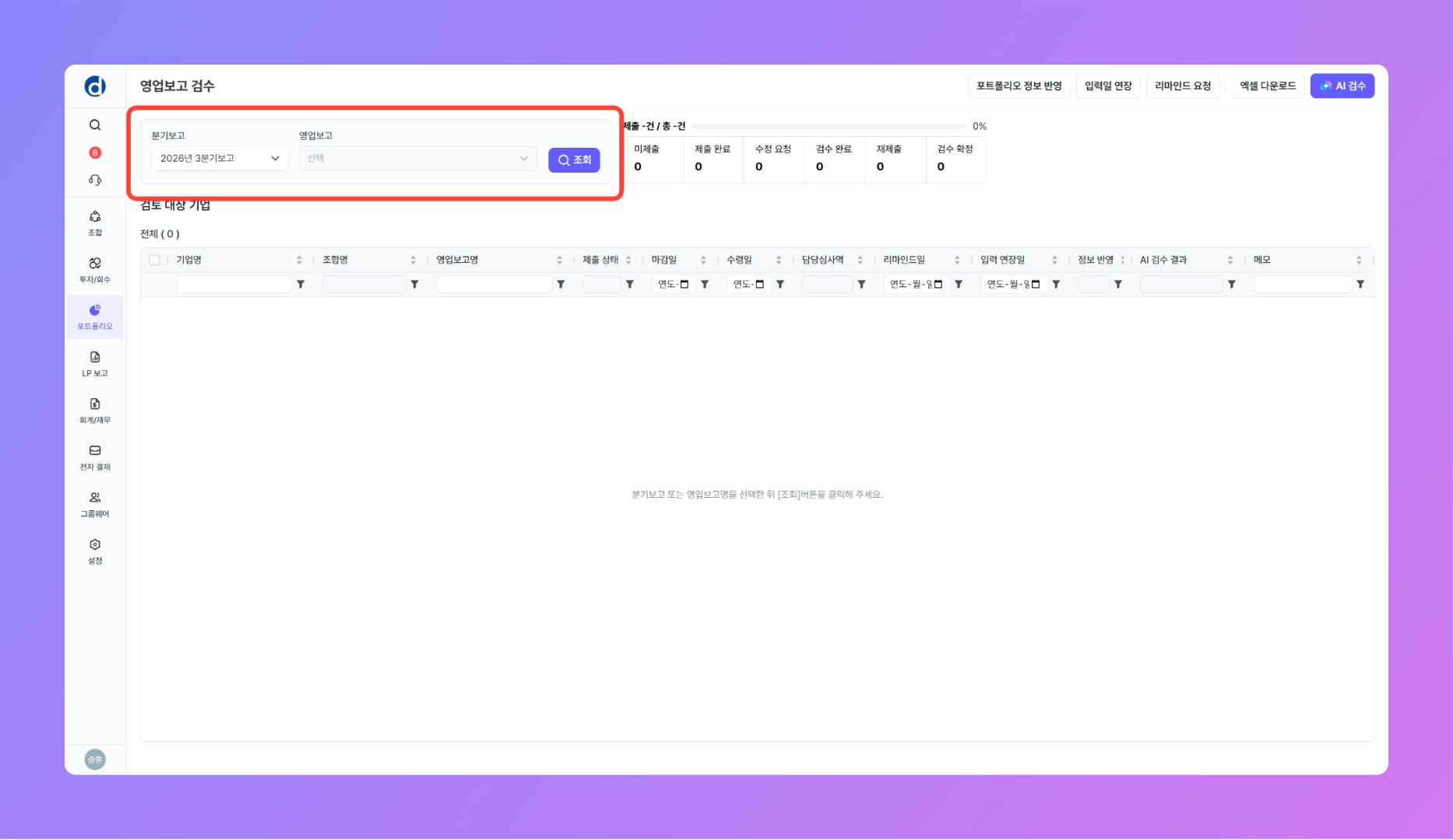 검수를 진행할 영업보고의 분기를 선택하고 [조회] 버튼을 클릭합니다.