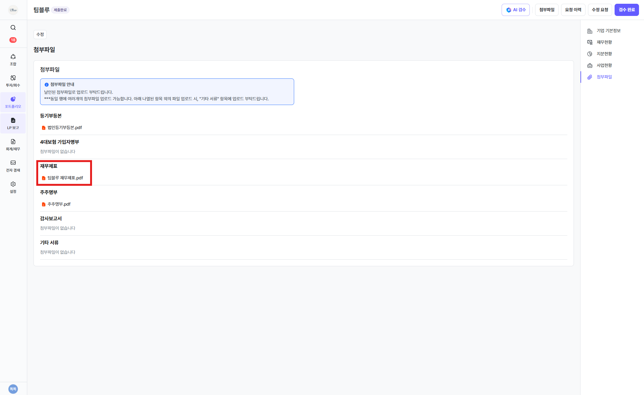 스타트업 측에서 송부한 재무제표 첨부파일 및 입력 내용이 일치하는지 검수하는 과정의 수고로움을 줄이기 위해 개발된 기능입니다. (본 기능의 검수 범위는 "재무제표"에 한하여 가능합니다.)