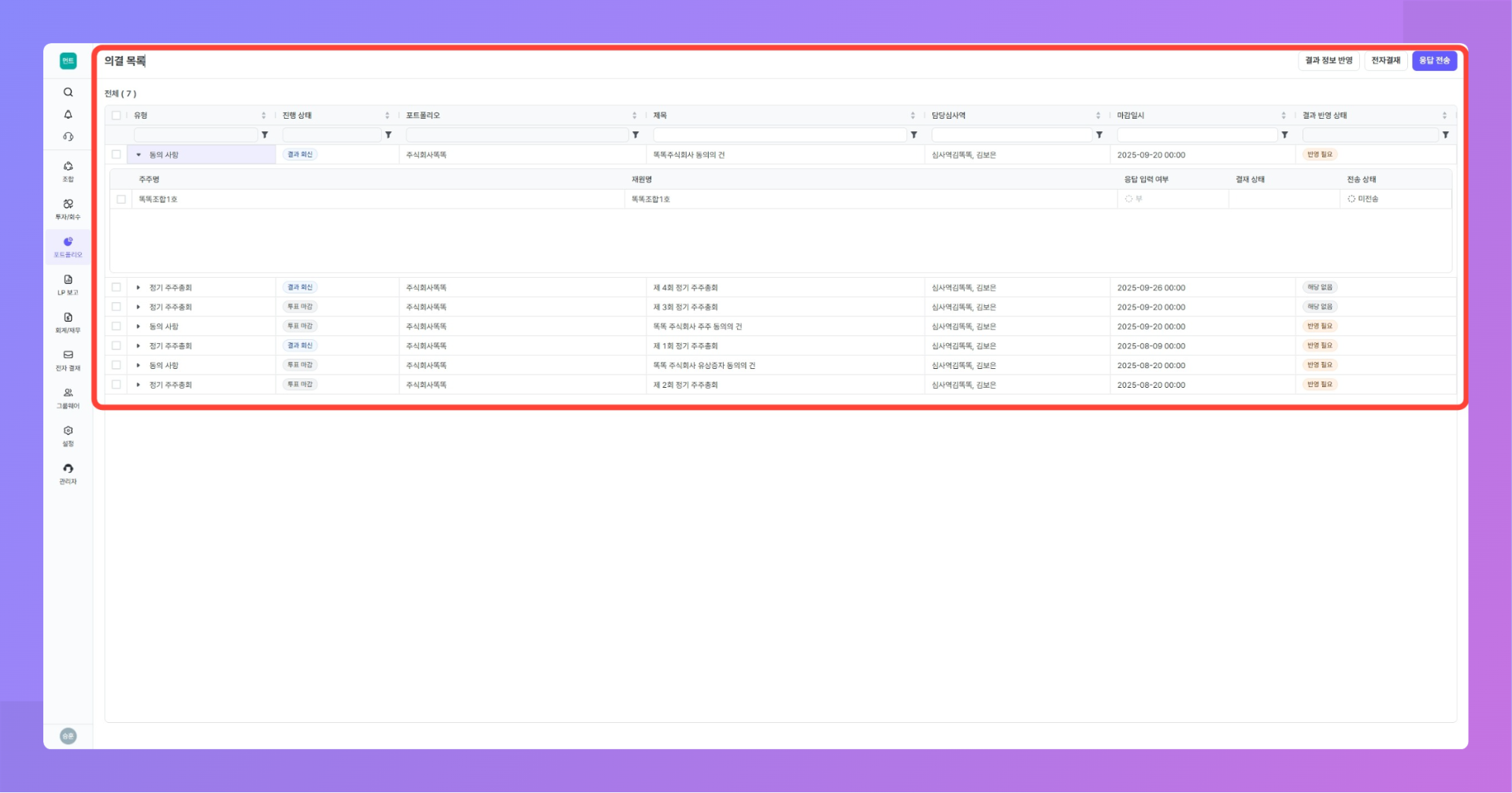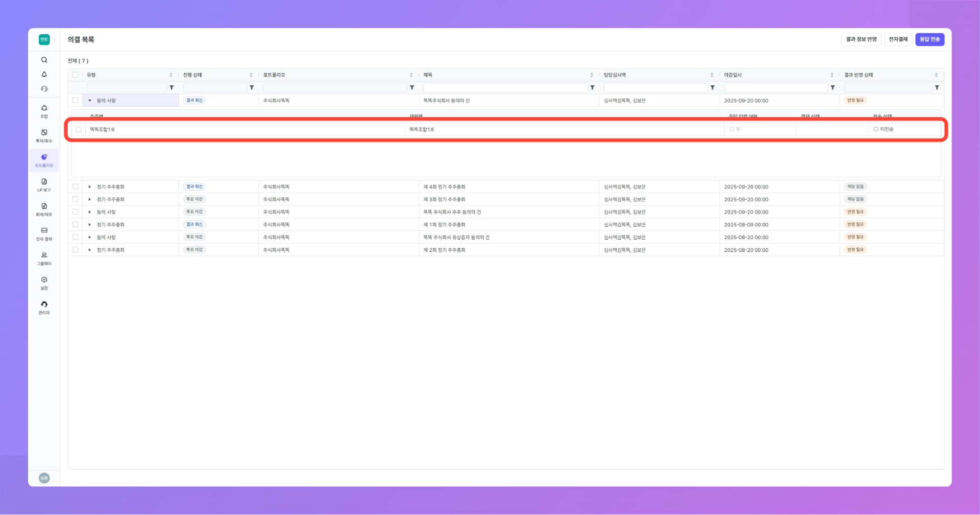 Table in Table 안에 행을 클릭함으로 의결 상세로 이동이 가능합니다.