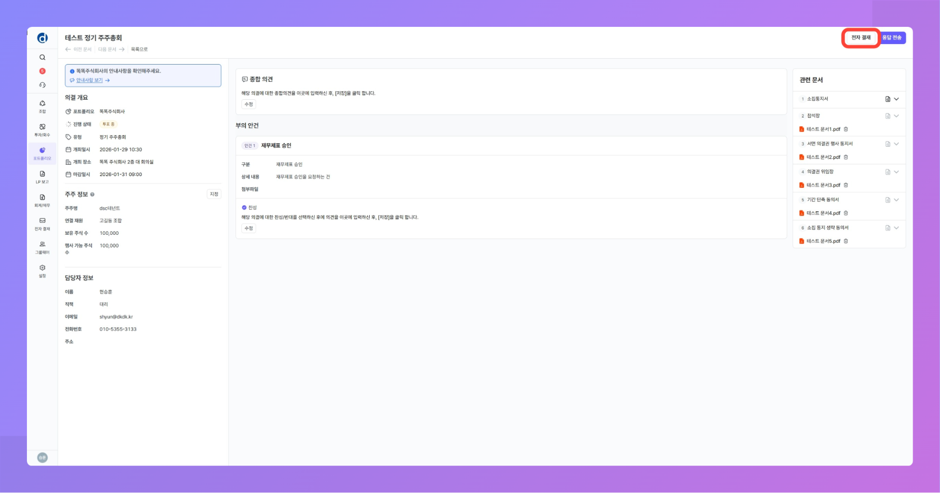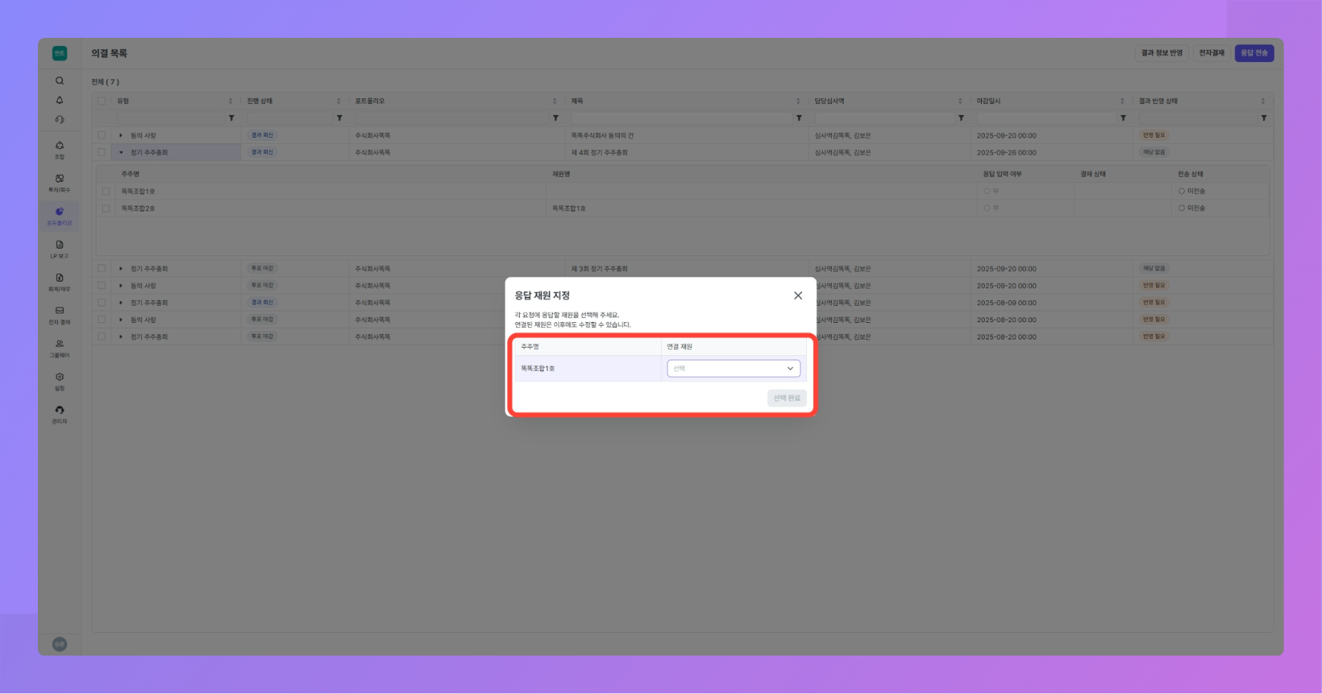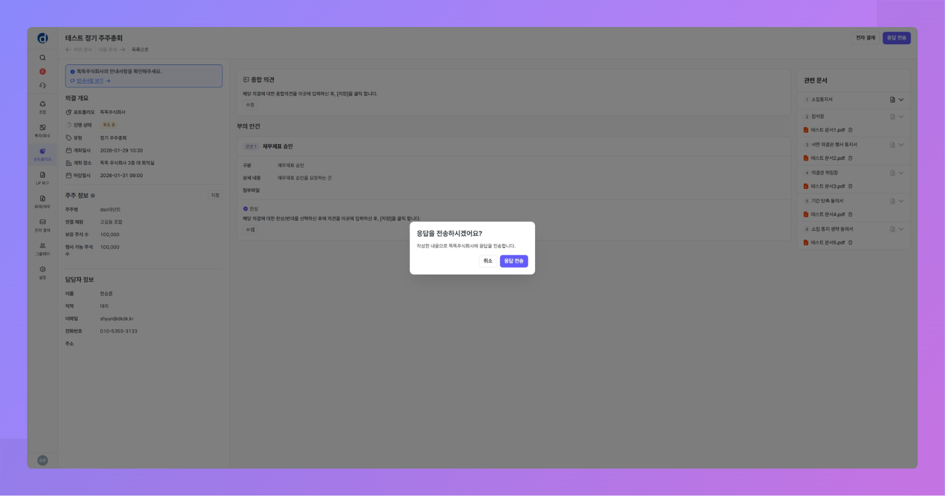 결재가 완료되었다면, 다시 의결 상세 페이지로 돌아와서 우측 상단 [응답 전송] 클릭 > 팝업 내 [응답 전송] 클릭