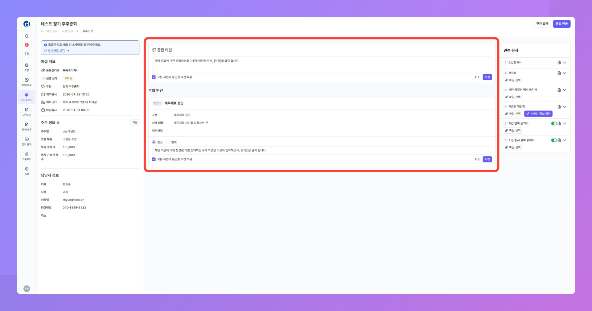 관련 문서는 의결을 진행함에 있어서 필요한 문서의 출력 또는 응답 문서를 첨부하는 섹션입니다.