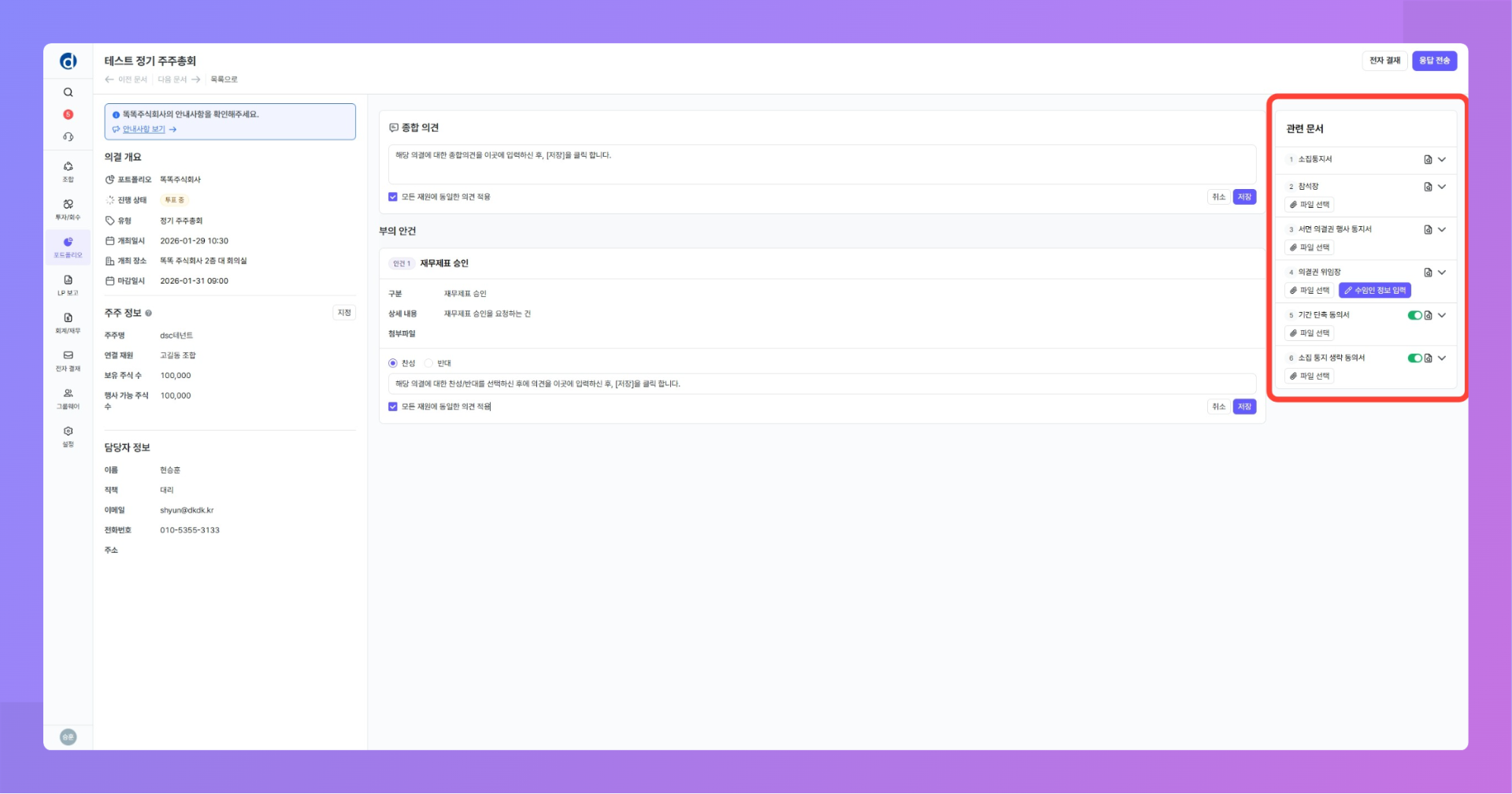 동의서와 같이 서명이 필요한 문서는 출력 하여 서명 한 후에 [파일 선택] 버튼을 통해 첨부가 가능합니다. 관련 문서 섹션은 스타트업이 의결 요청 시에 목록을 선택하여 요청하게 됩니다.
