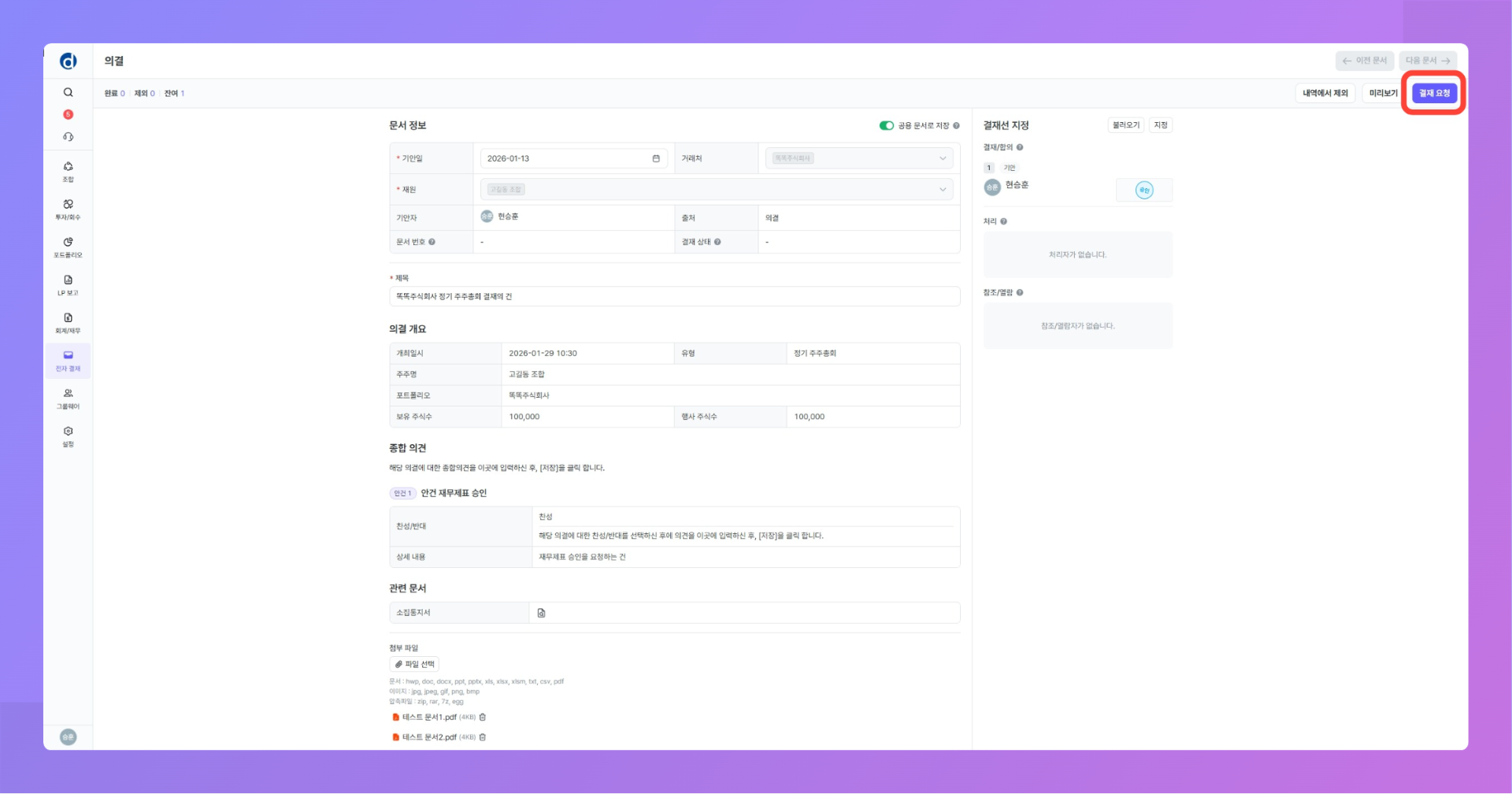 결재 요청 페이지에서 결재선을 지정한 뒤, [결재 요청] 버튼을 클릭하여, 결재를 진행합니다.