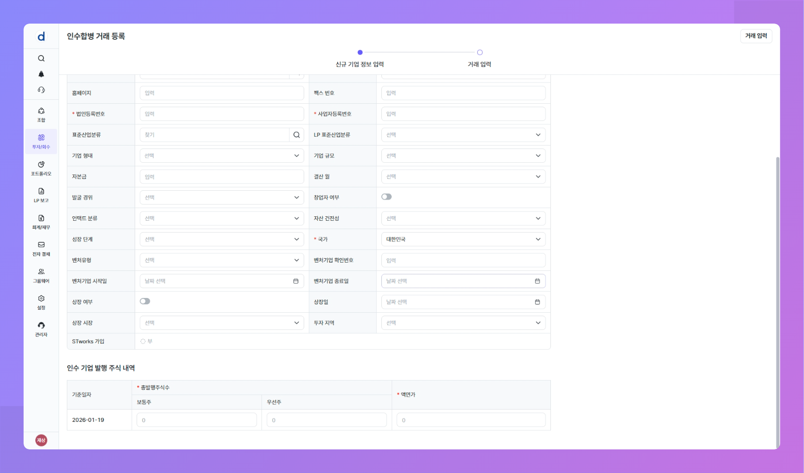 업무 플로우: 투자/회수 > 거래 원장 관리> [거래 등록] 버튼 클릭 > "거래유형" 중 인수합병 거래 유형 선택