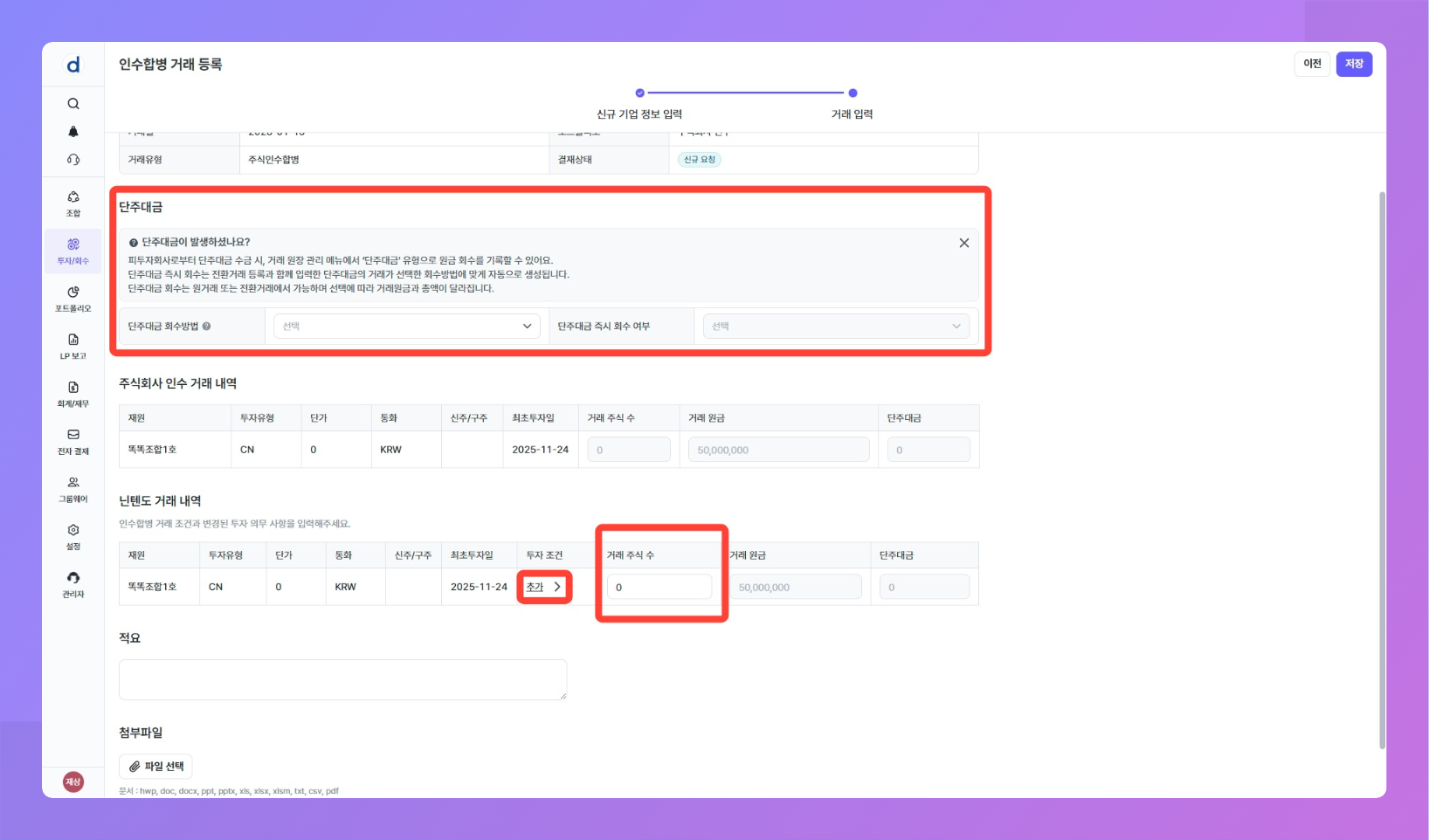 인수합병거래: 입력한 원금이 모두 인수합병거래로 전환되며, 인수합병거래에서 입력한 단주대금만큼 단주대금 거래가 등록됩니다.