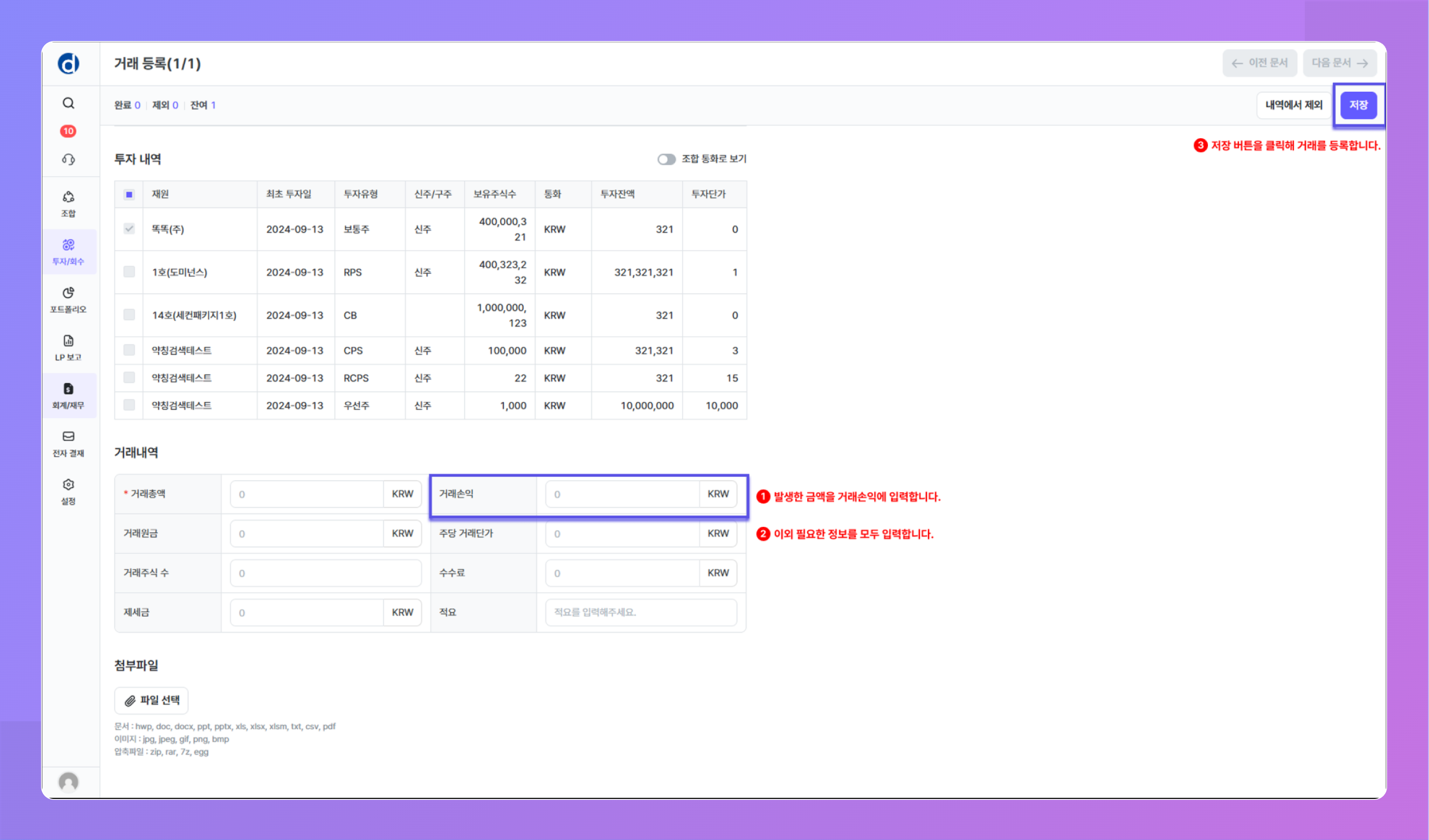 투자/회수 > 거래 원장 관리 > [거래 등록] 버튼을 클릭해 거래를 등록할 수 있어요.