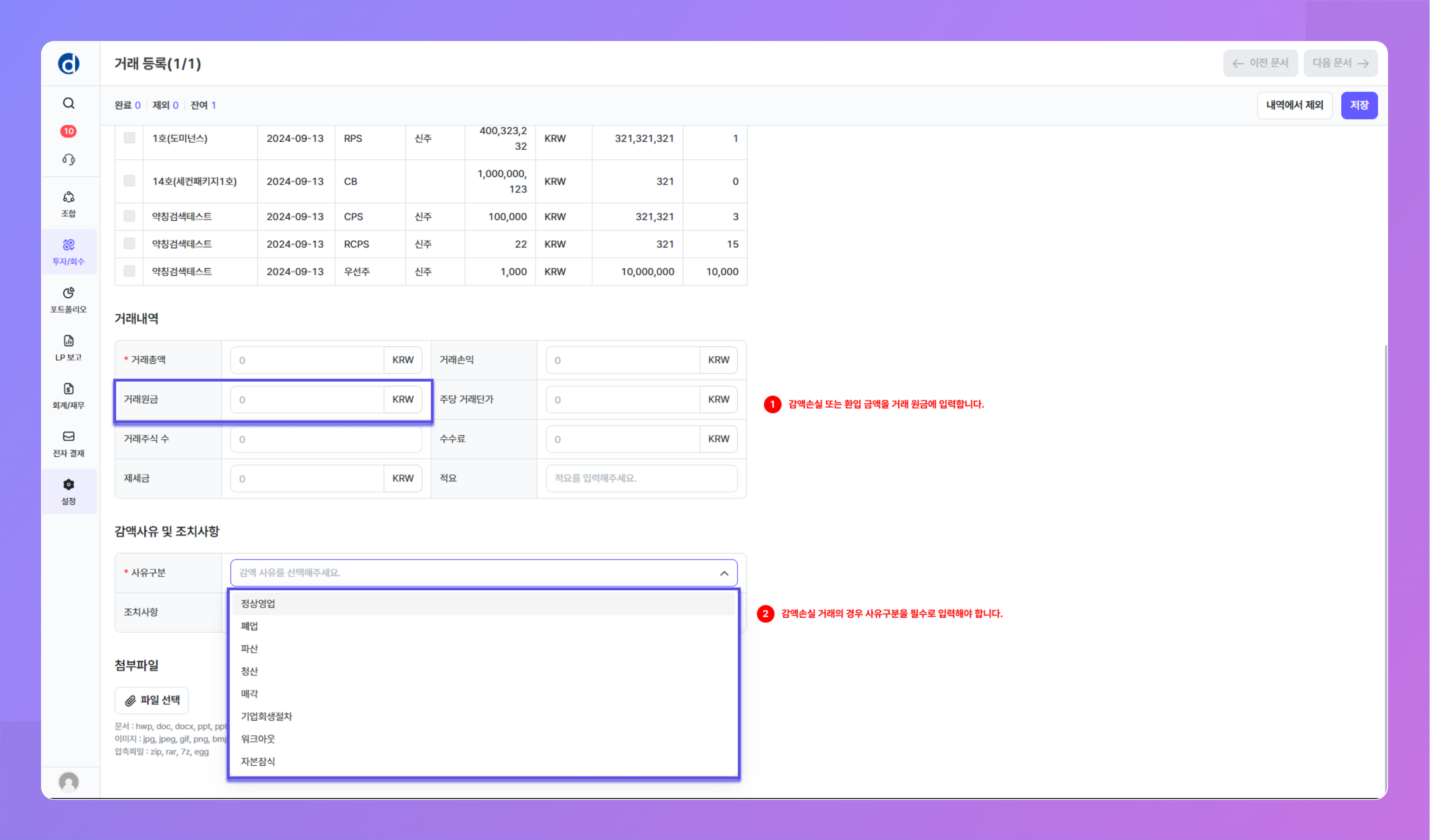 투자 내역에 감액손실 또는 감앤속실환입 발생했을 때 등록할 수 있습니다.