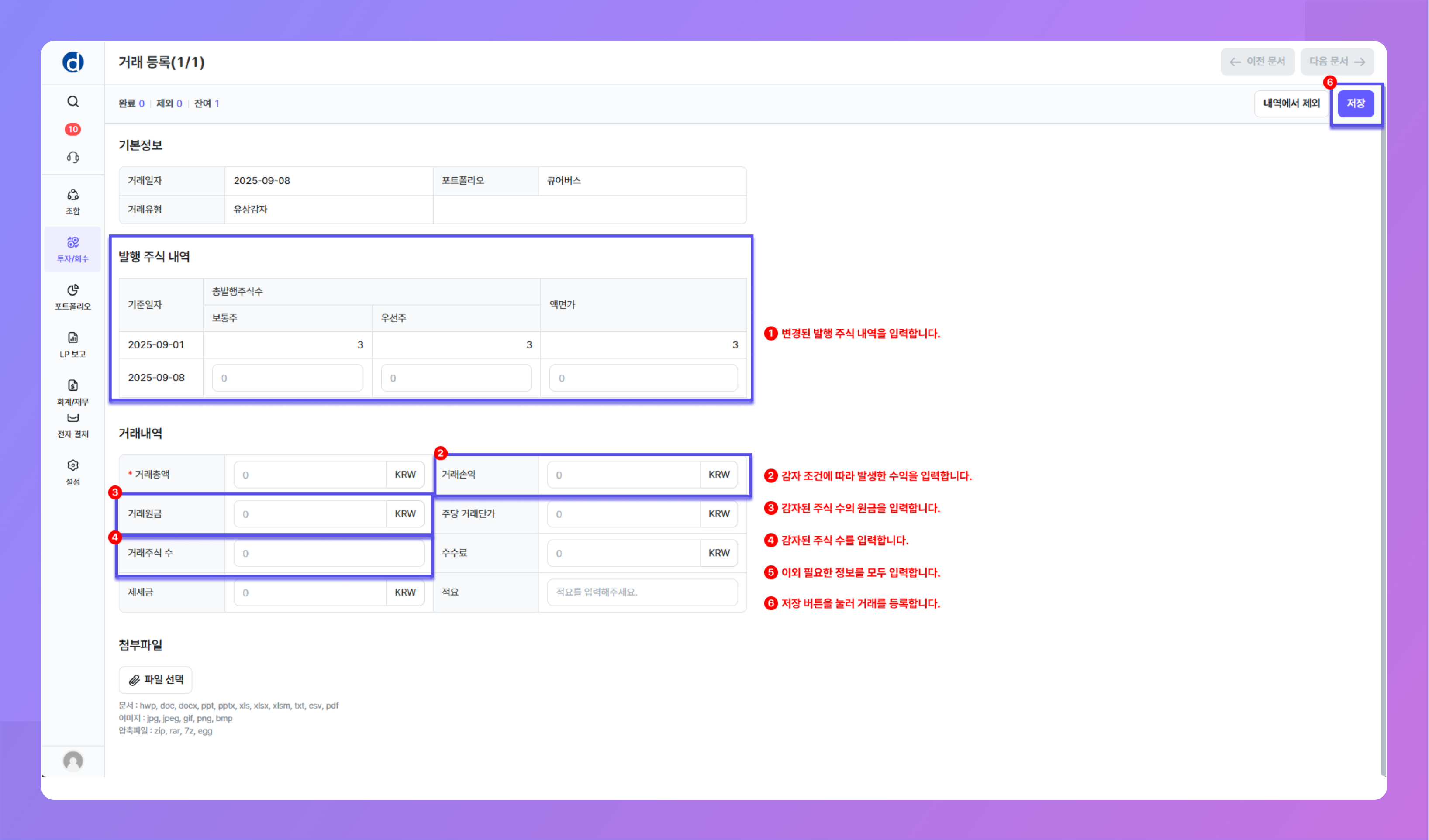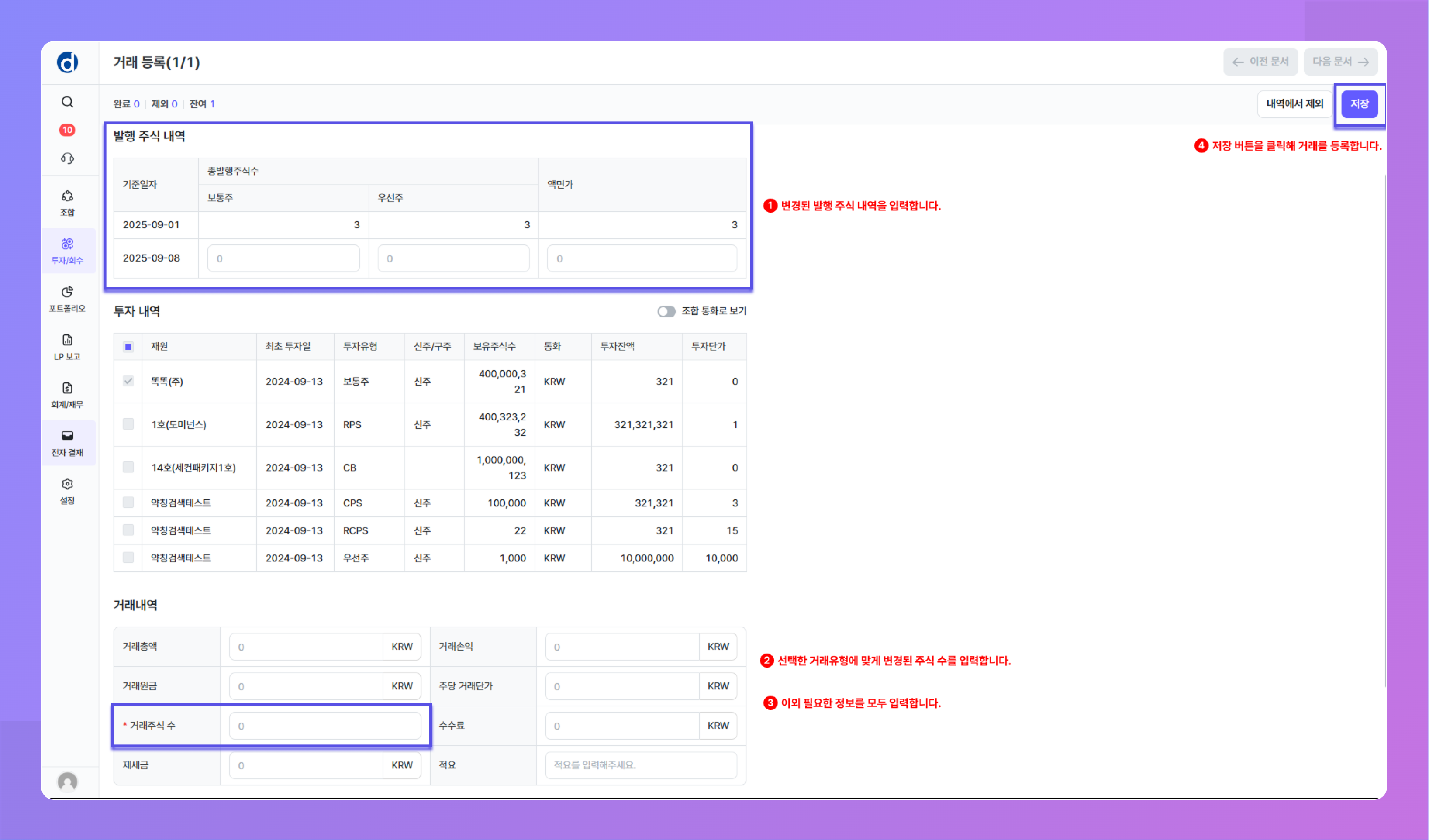 선택한 거래유형에 따라 변동된 주식 수를 "거래주식 수"에 입력해주세요.