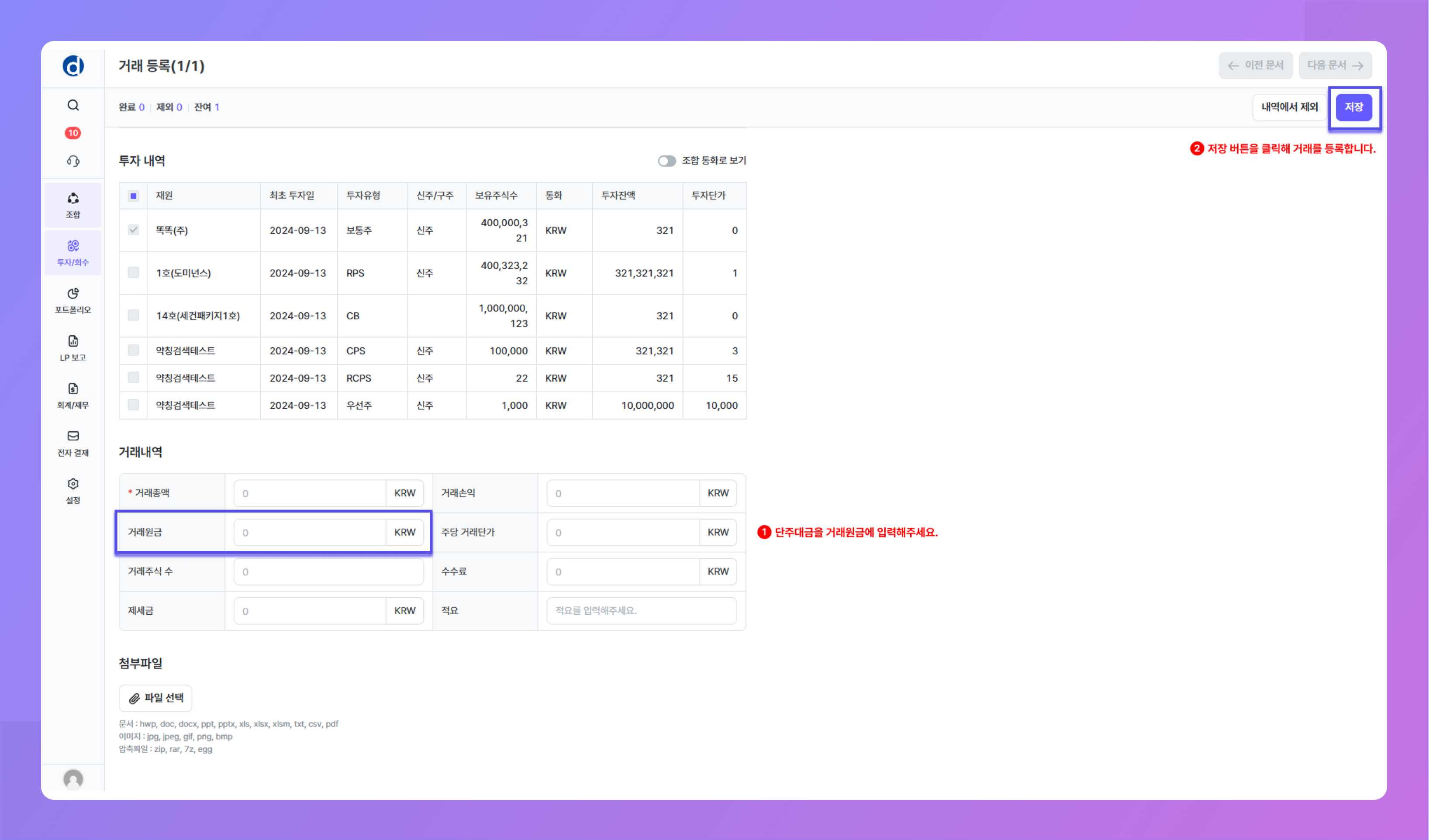 [거래 등록] 버튼을 클릭해 투자 변동을 등록할 투자 거래를 선택해주세요.