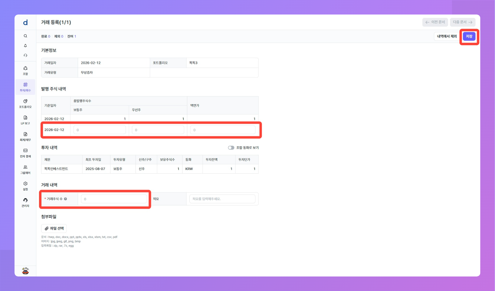 포트폴리오에 변경된 발행 주식 내역을 "발행 주식 내역" 섹션에 입력해주세요.