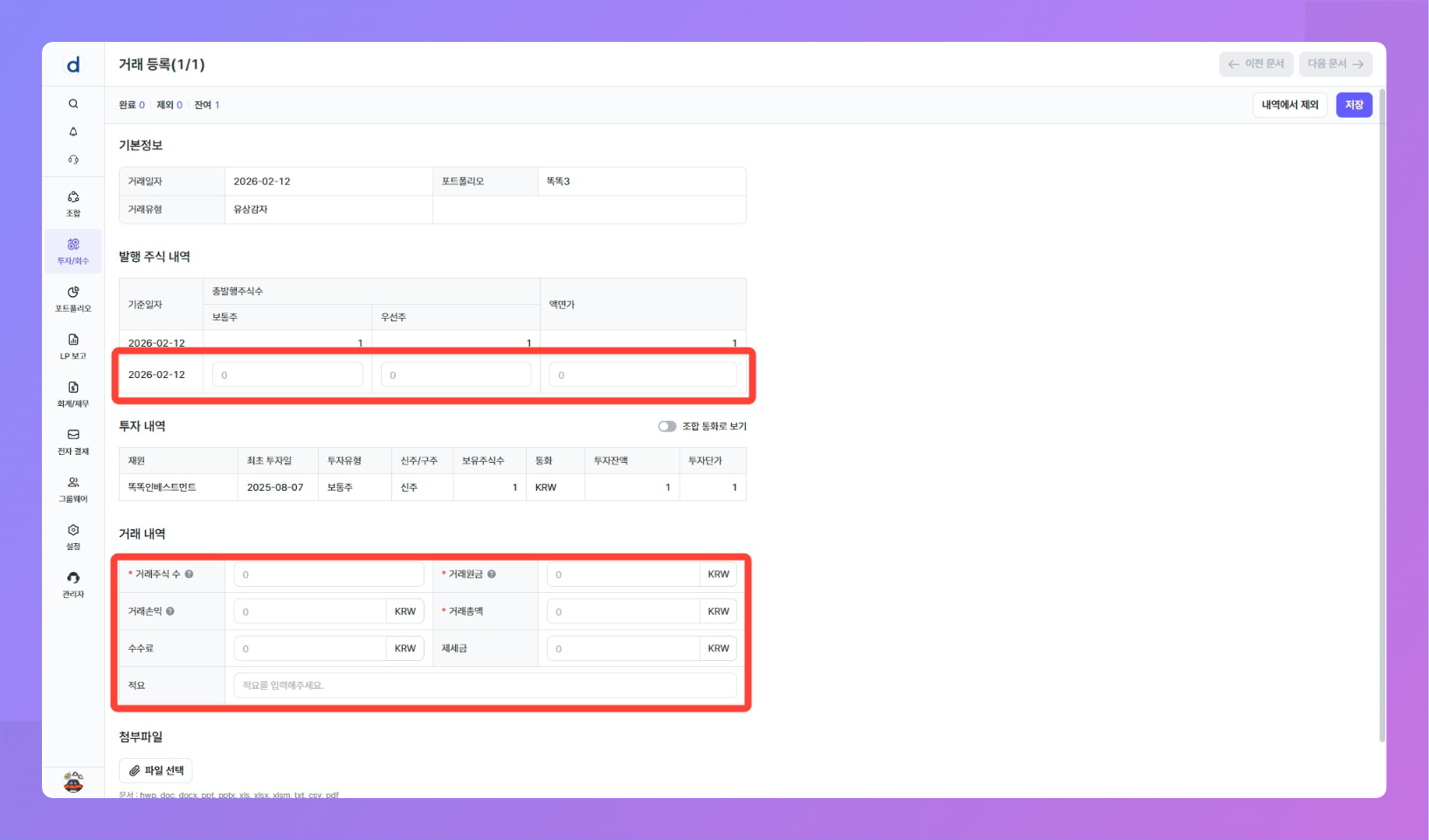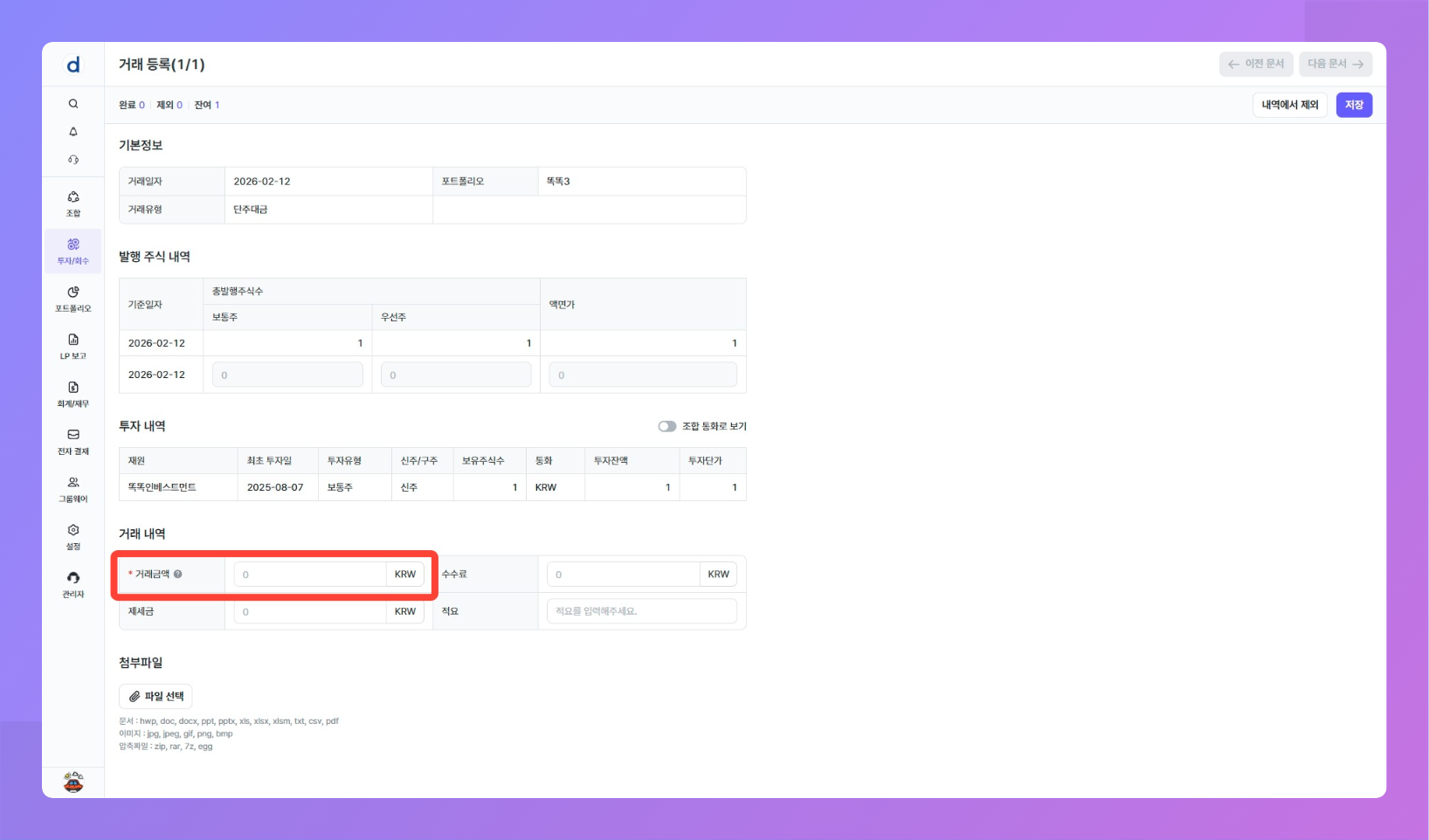 업무 플로우: 투자/회수 > 거래 원장 관리> [거래 등록] 버튼 클릭 > "거래유형" 중 일반 거래 유형 선택