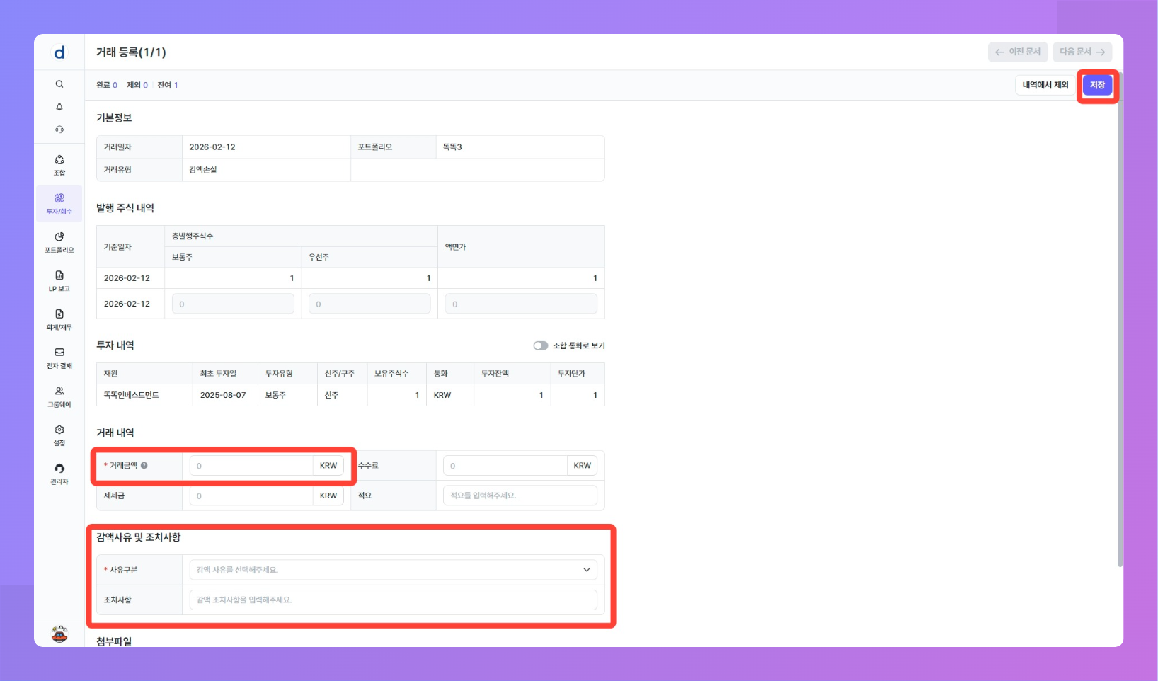 투자 내역에 감액손실 또는 감앤손실환입 발생했을 때 등록할 수 있습니다.