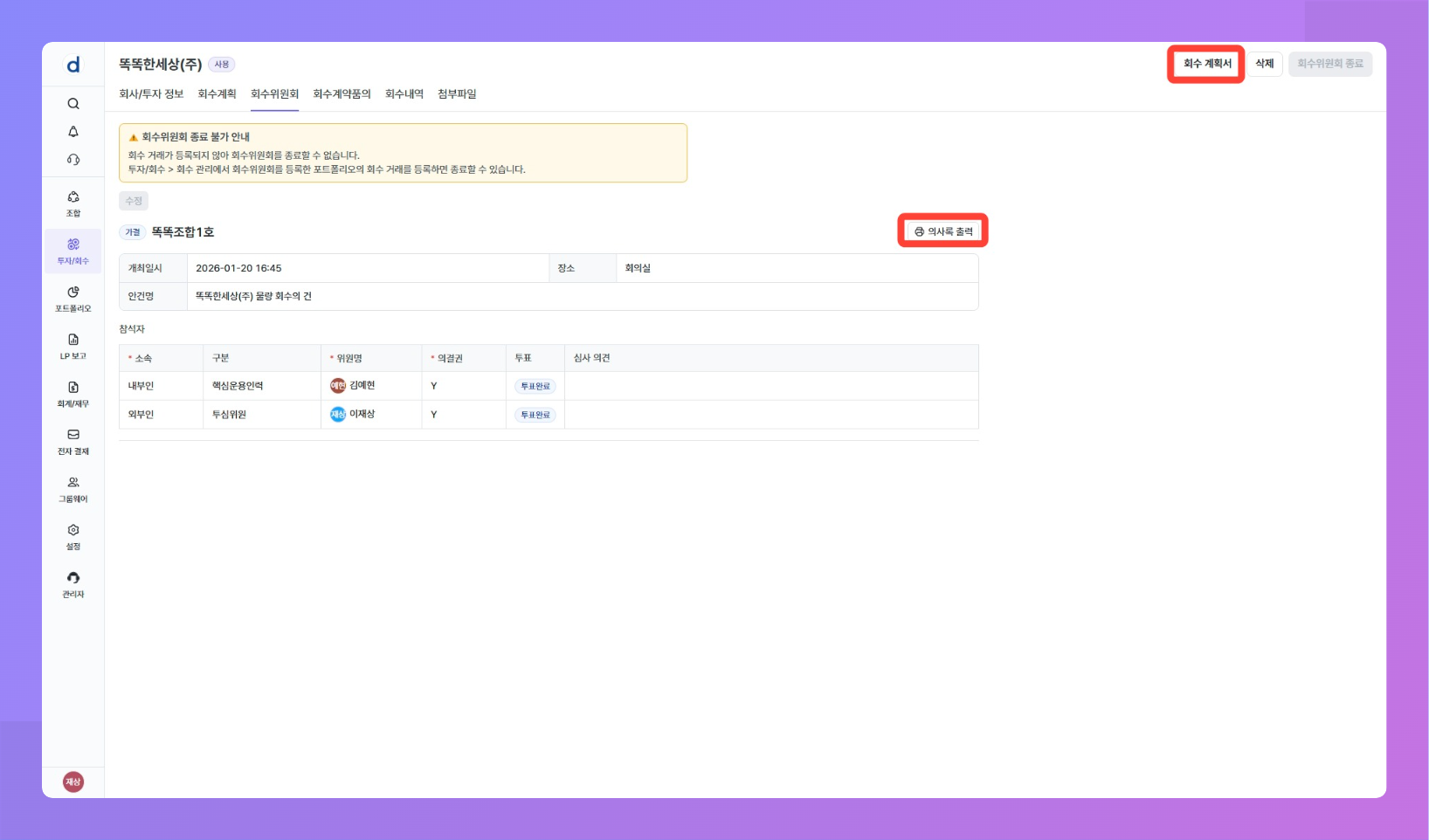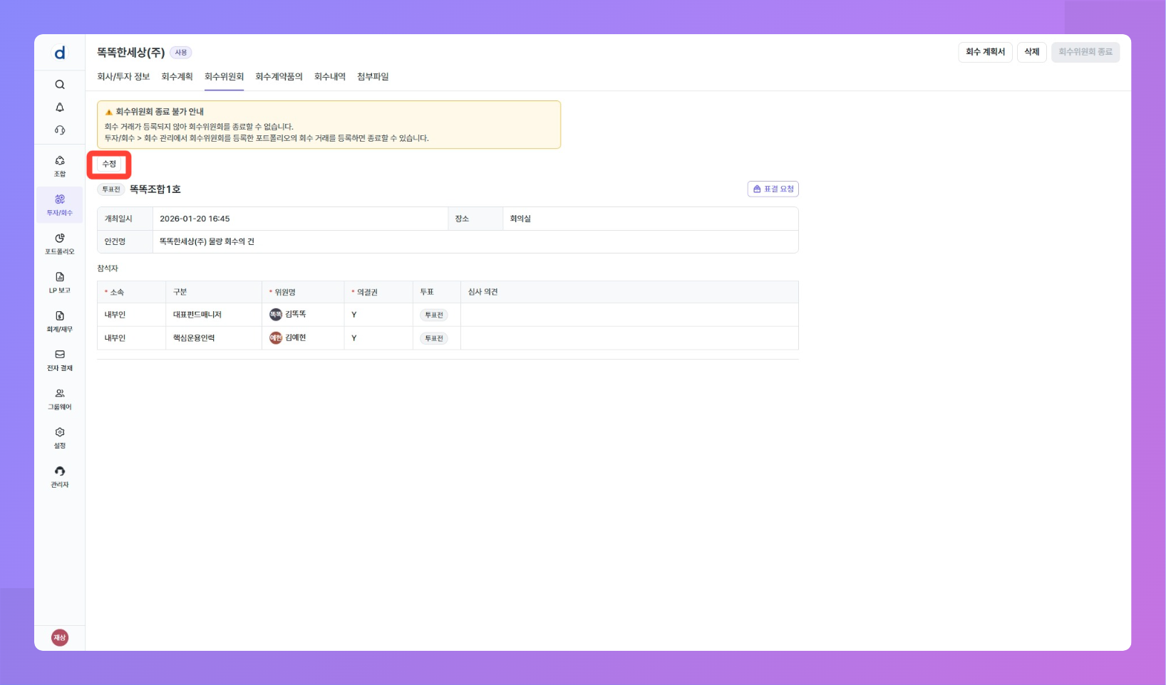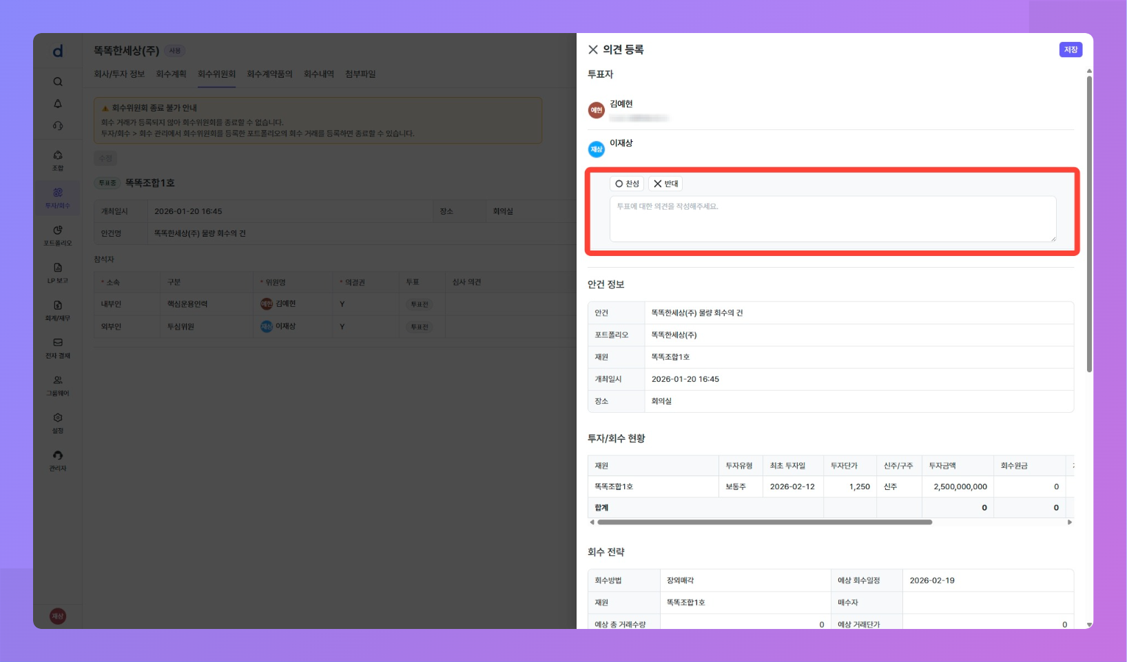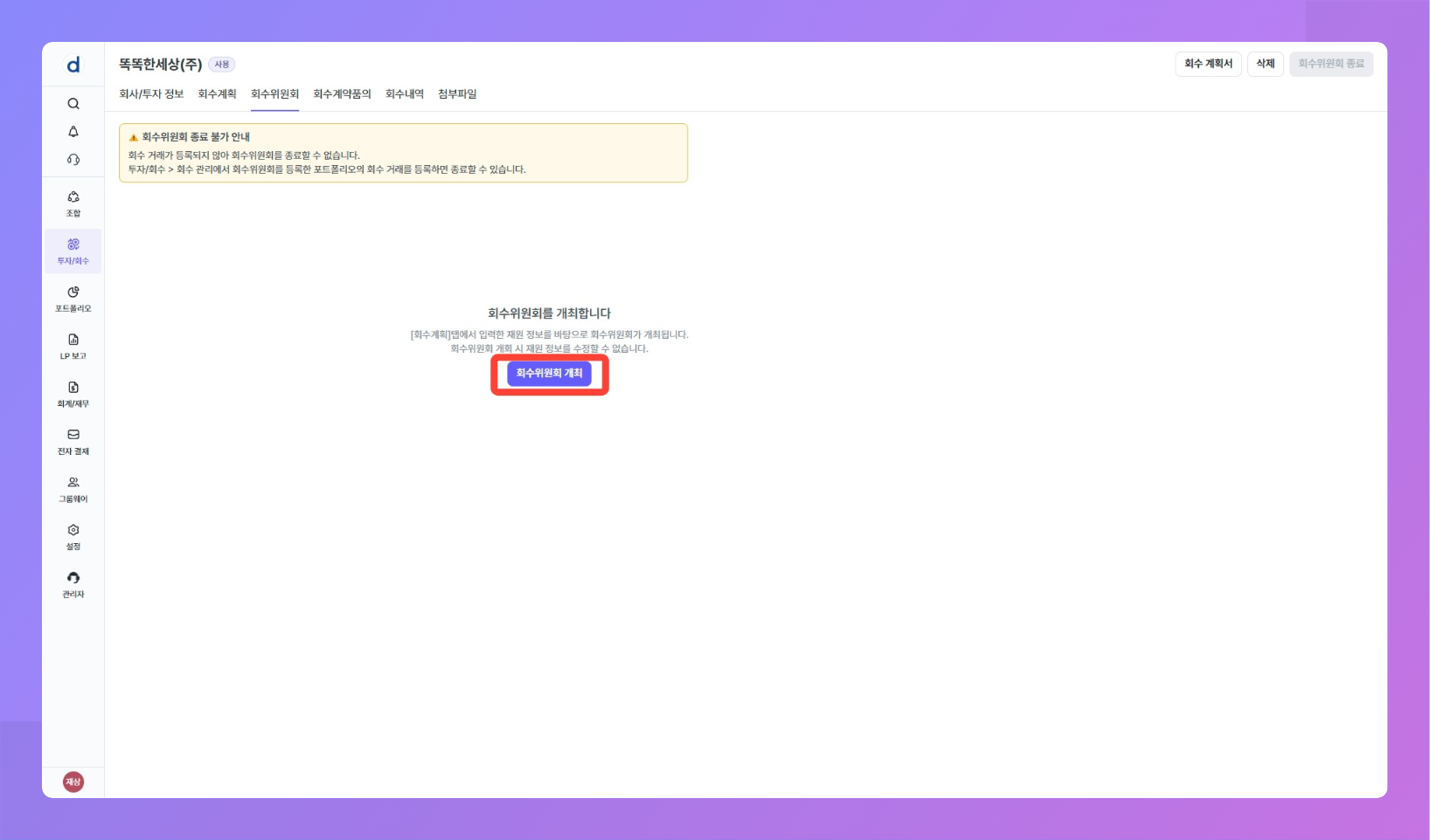 목적: 투자 후 회수 시점이 되었을 때 회수 거래를 등록하기 전 예상 회수 내역에 대한 회수 위원회를 개최할 수 있어요.