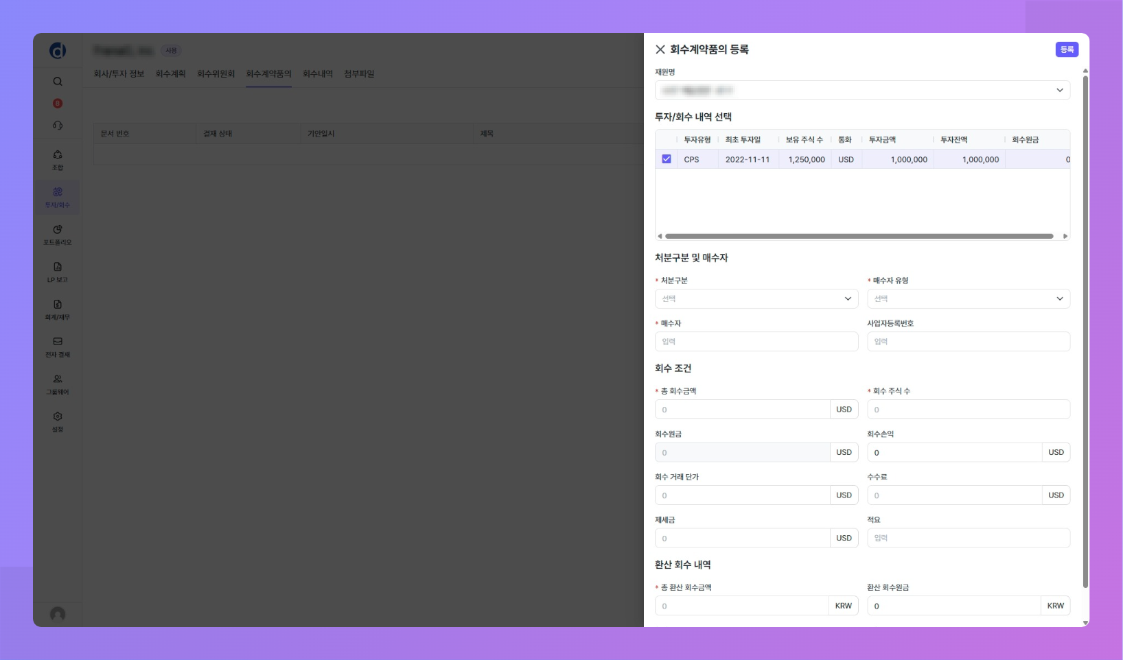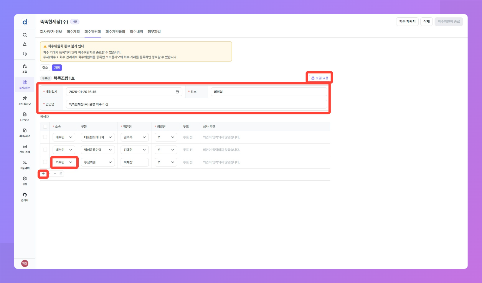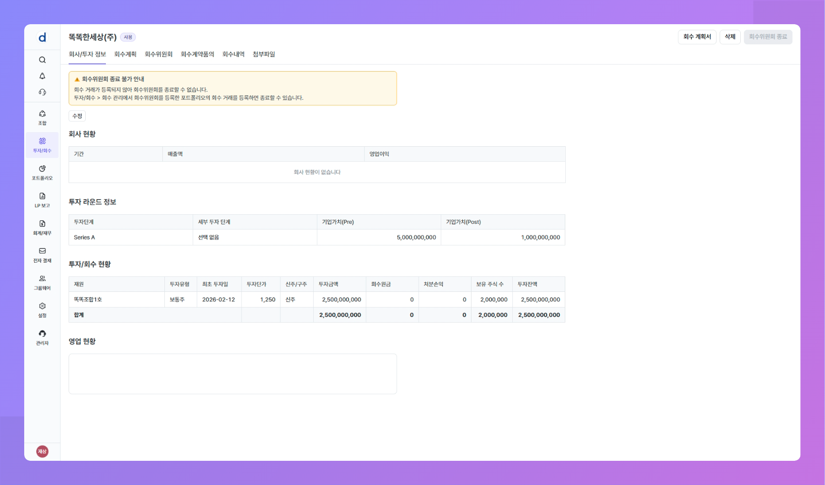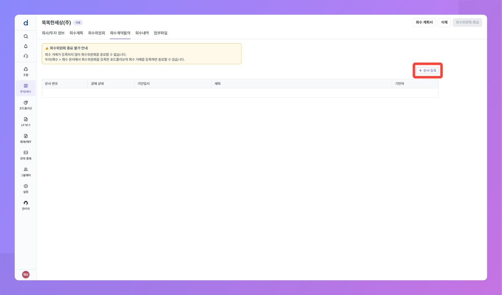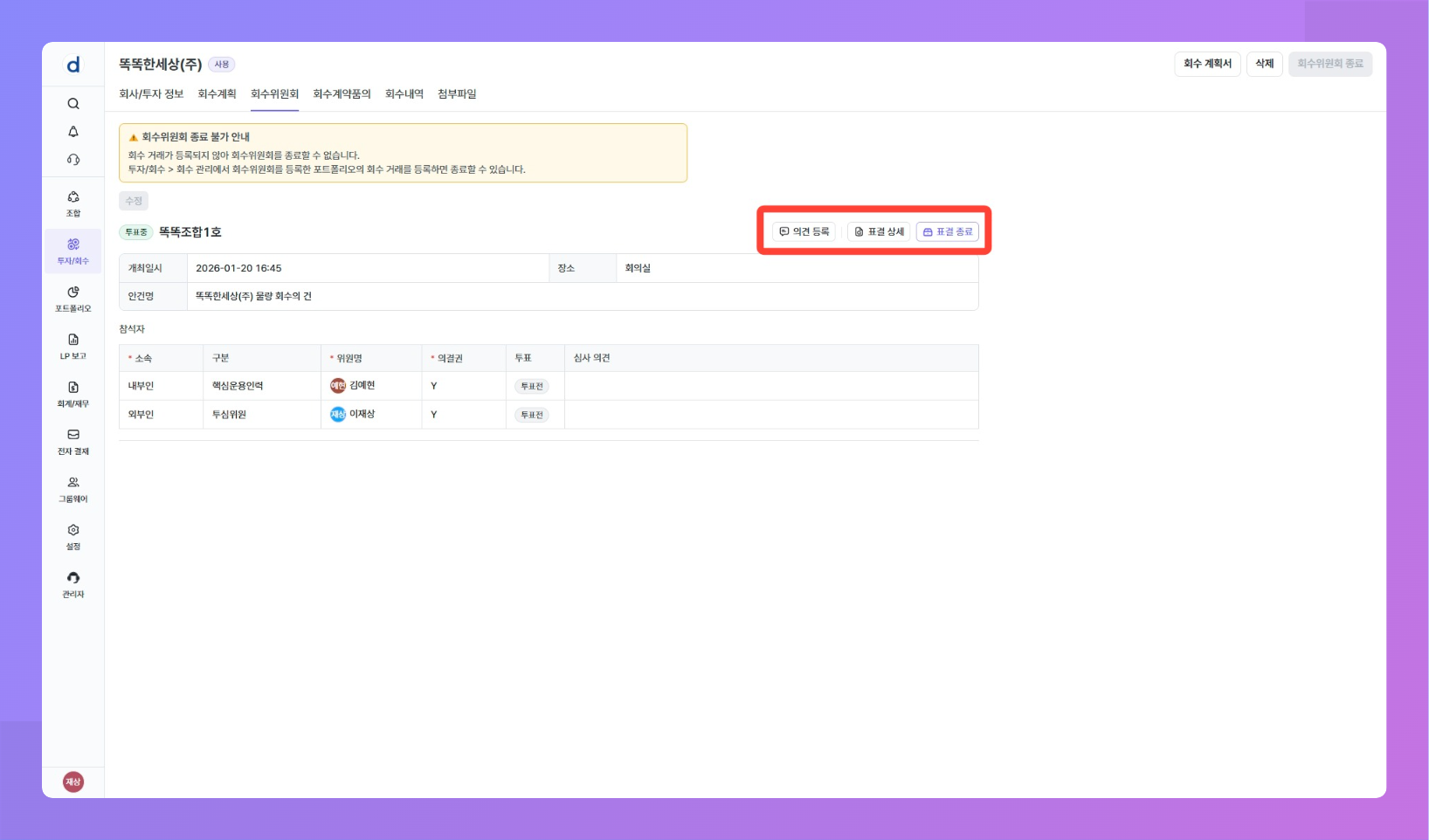 목적: 투자 후 회수 시점이 되었을 때 회수 거래를 등록하기 전 예상 회수 내역에 대한 회수 위원회를 개최할 수 있어요.