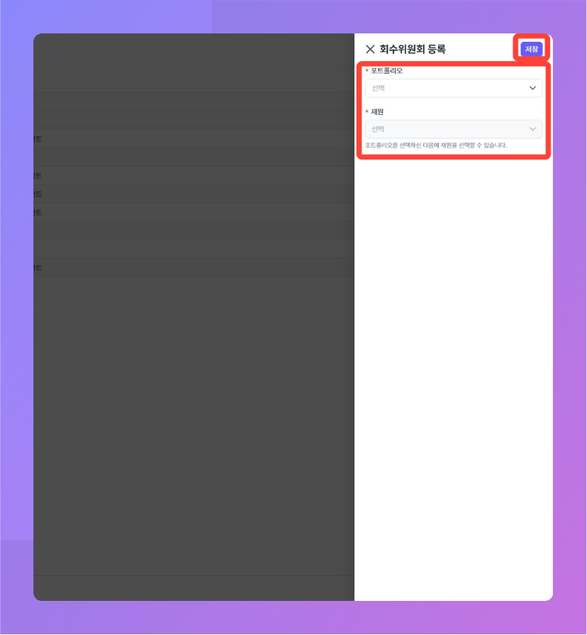 회수 예정인 포트폴리오와 재원을 선택하세요.