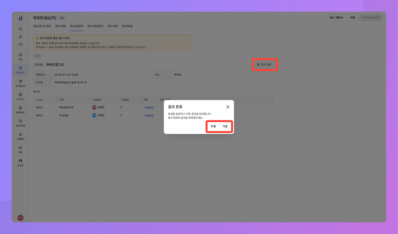 [결과 등록] 버튼을 클릭해 회수위원회 가결/부결 여부를 선택해주세요.